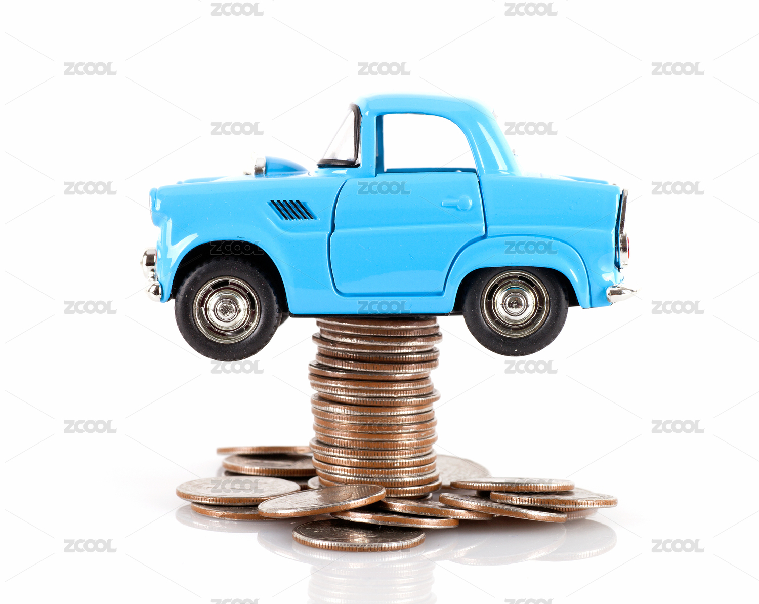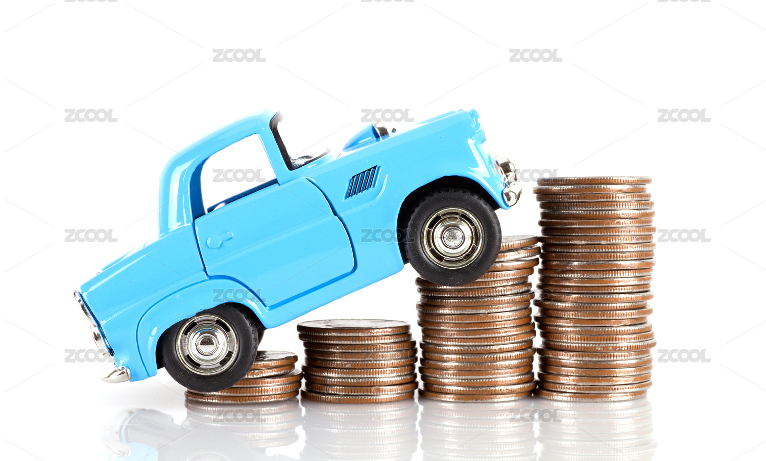 白背景上被一摞美元硬币顶起的蓝色小汽车模型