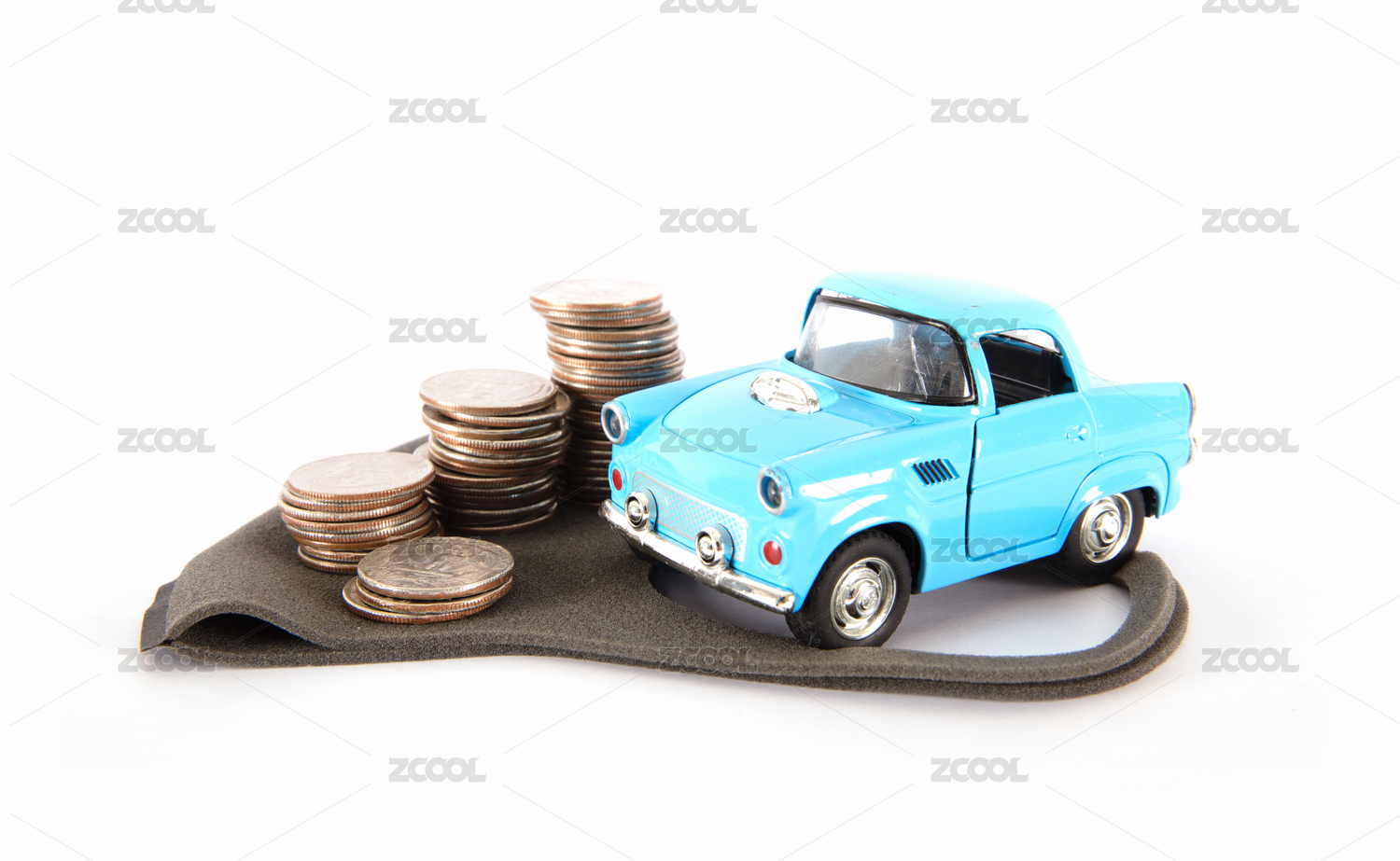 美元硬币和蓝色小汽车模型