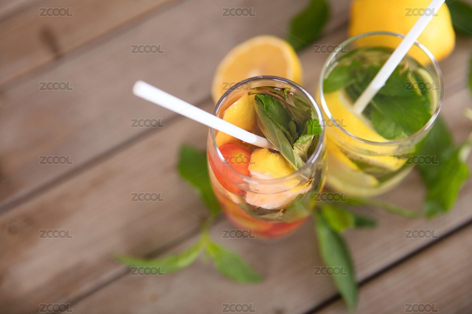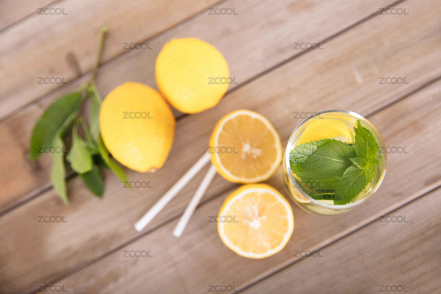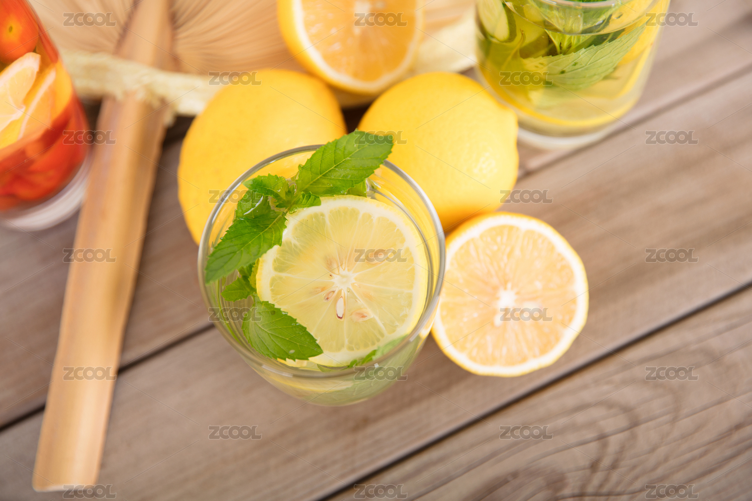 桌子上一杯柠檬薄荷茶和新鲜切开的柠檬果