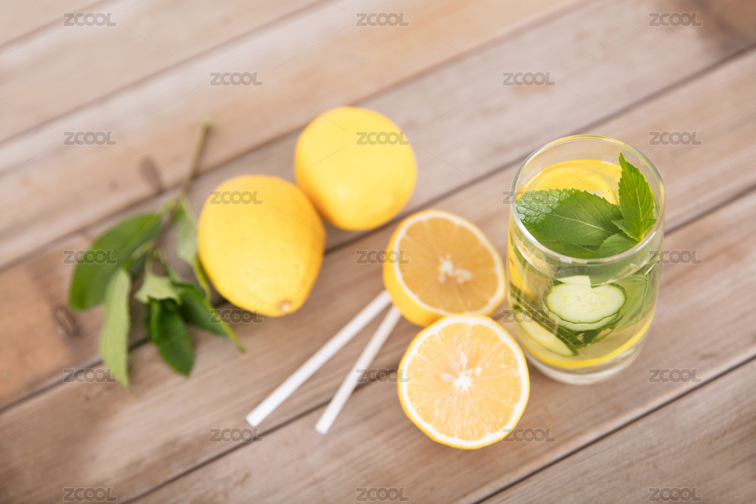 砧板上一杯柠檬黄瓜水和新鲜的柠檬果及冰块和薄荷叶