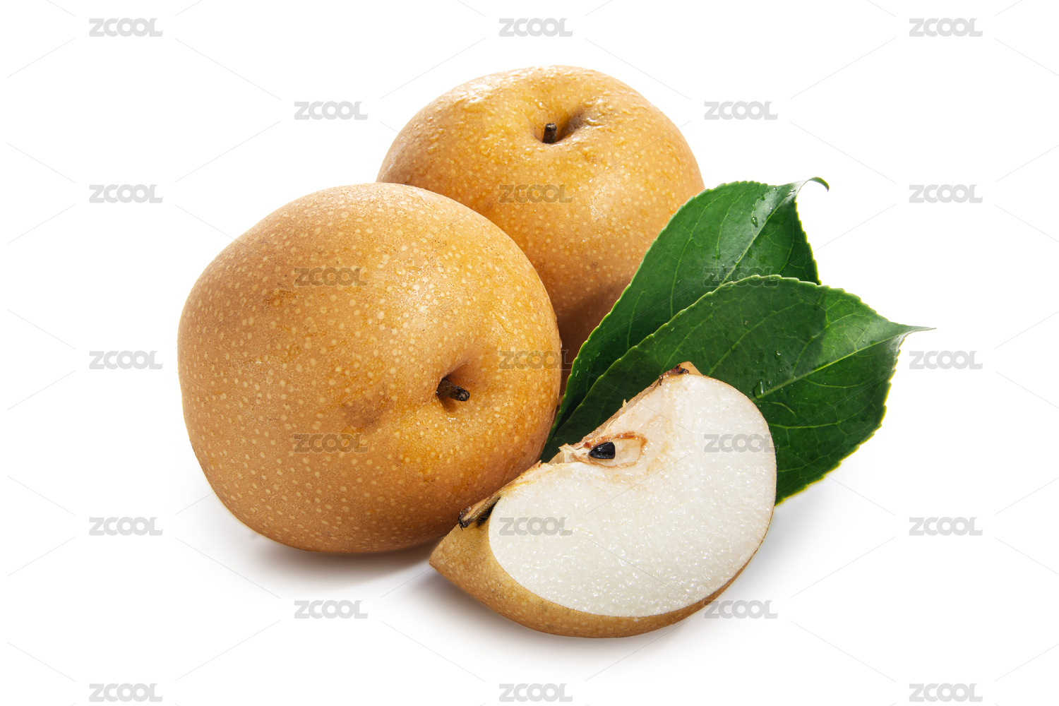 丰水梨和切开果肉带绿叶子白底