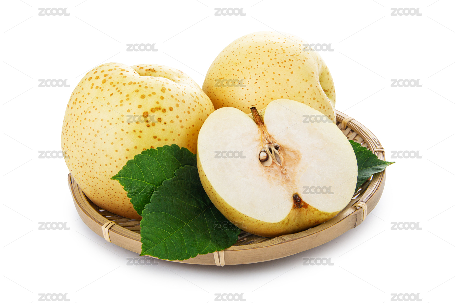 黄金梨和切开果肉带绿叶子装竹篮白底
