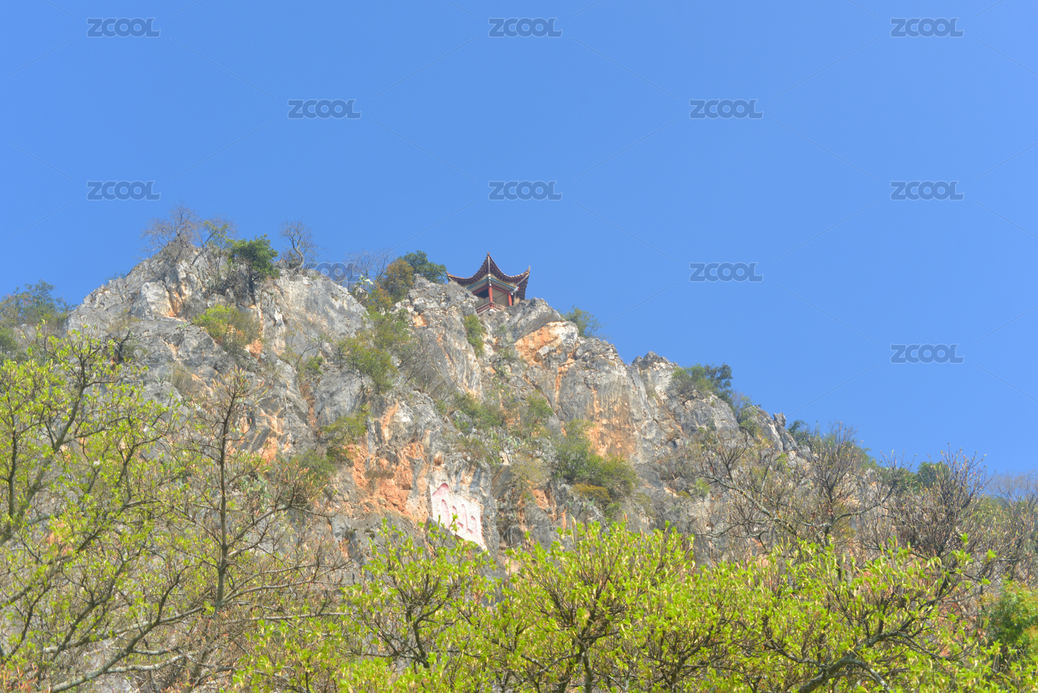 中国云南抚仙湖笔架山顶峰碧波亭仰拍