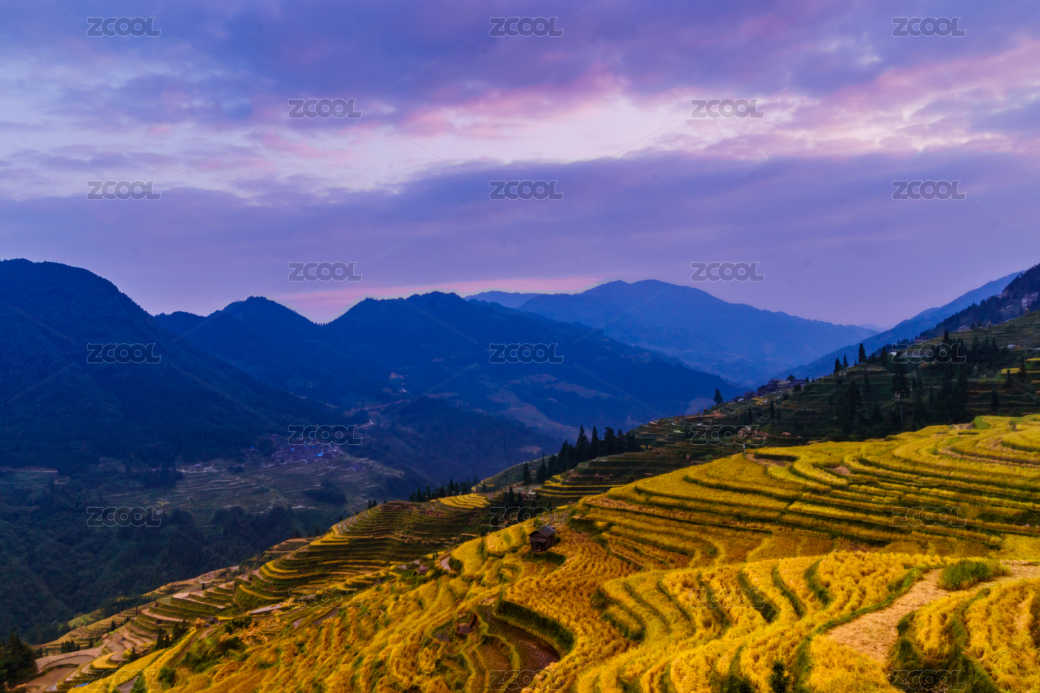 中国贵州黔东南加榜加车村秋季傍晚梯田与远山