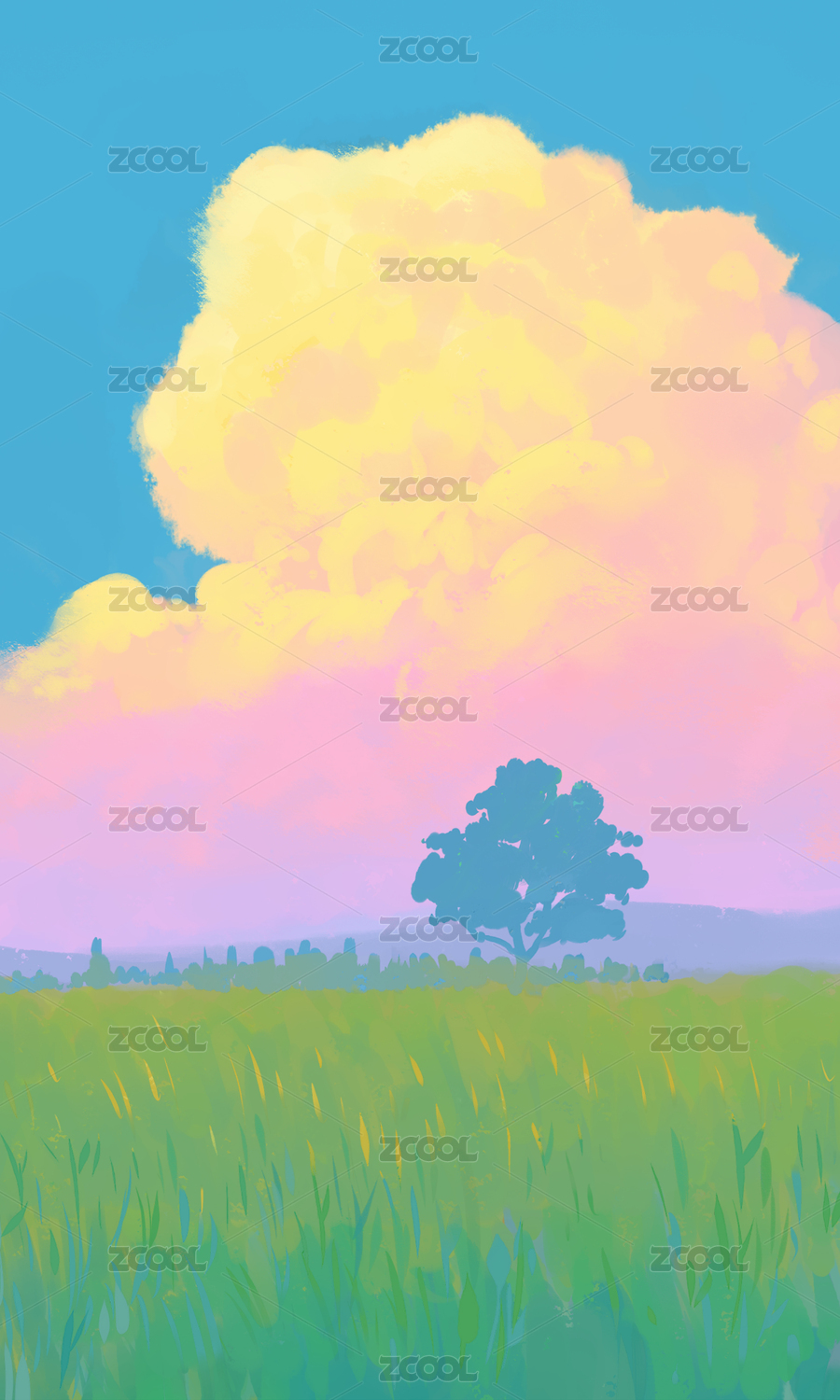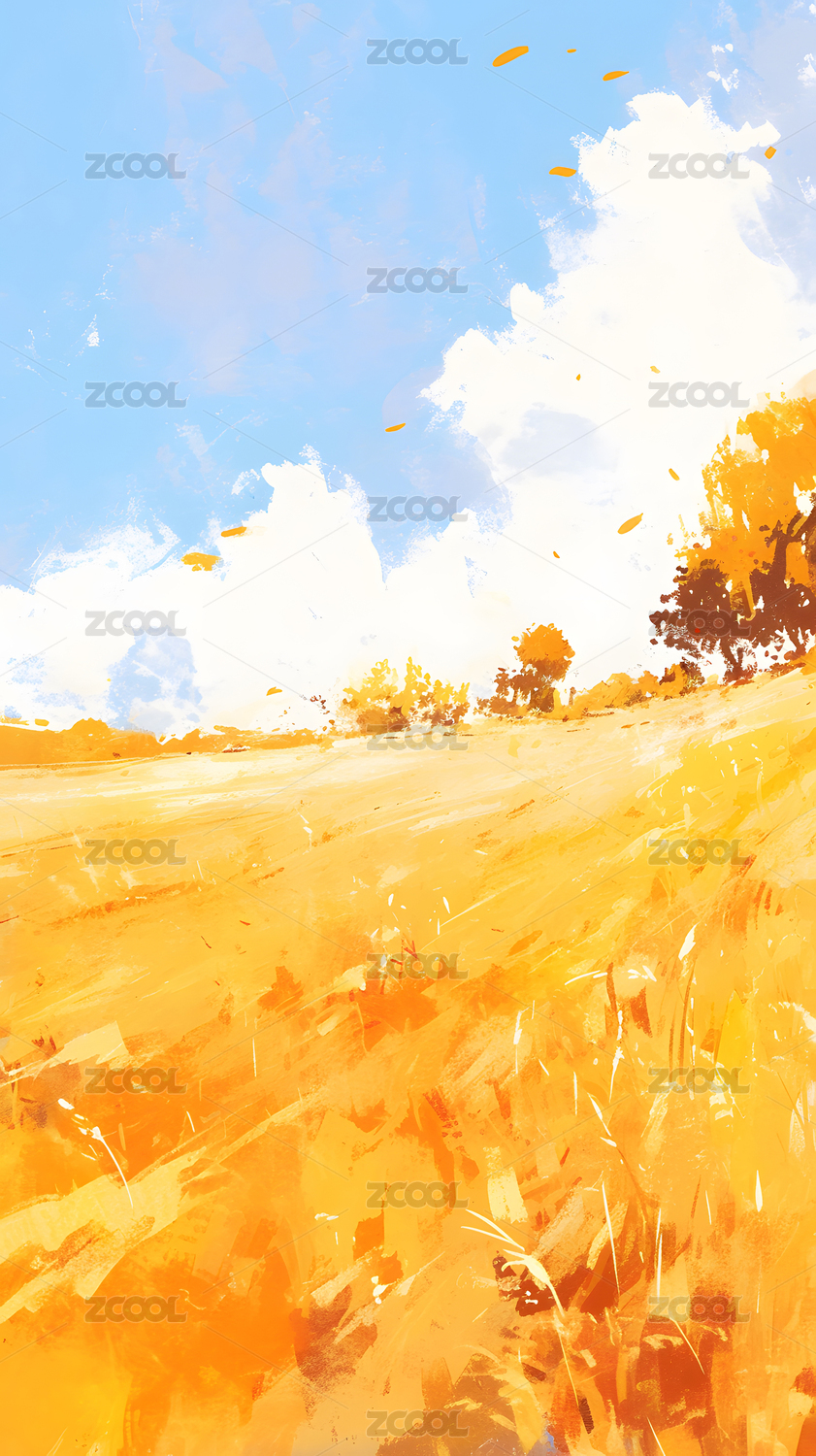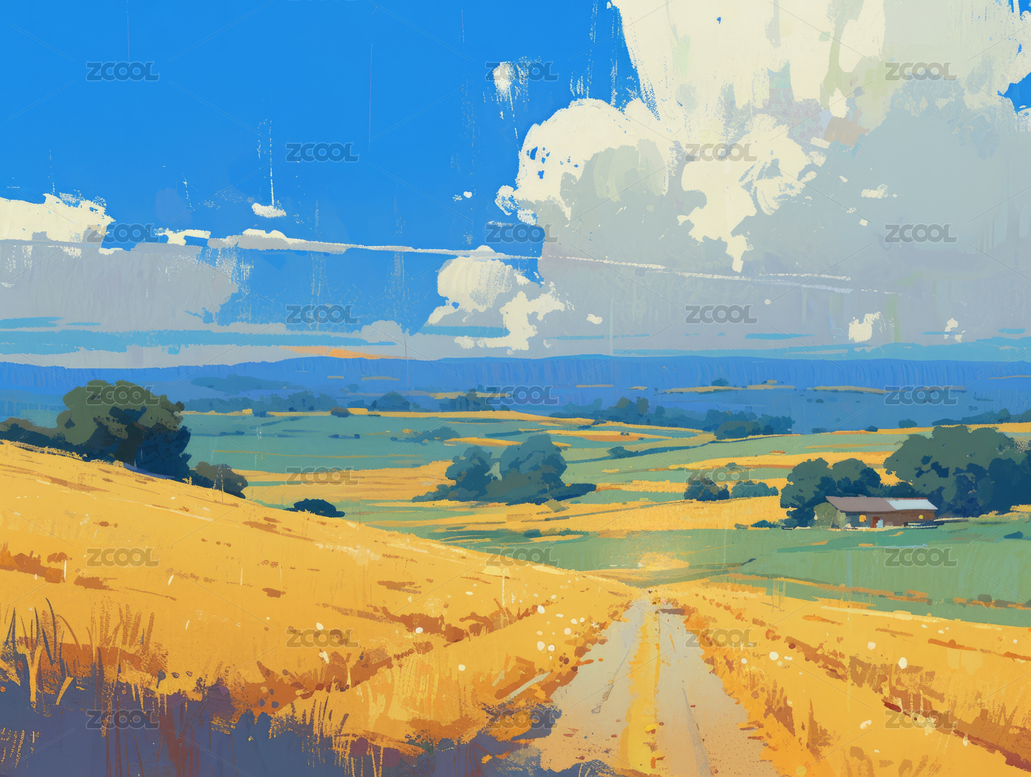稻田,白云,树木,飞机,远景,油画,蓝天