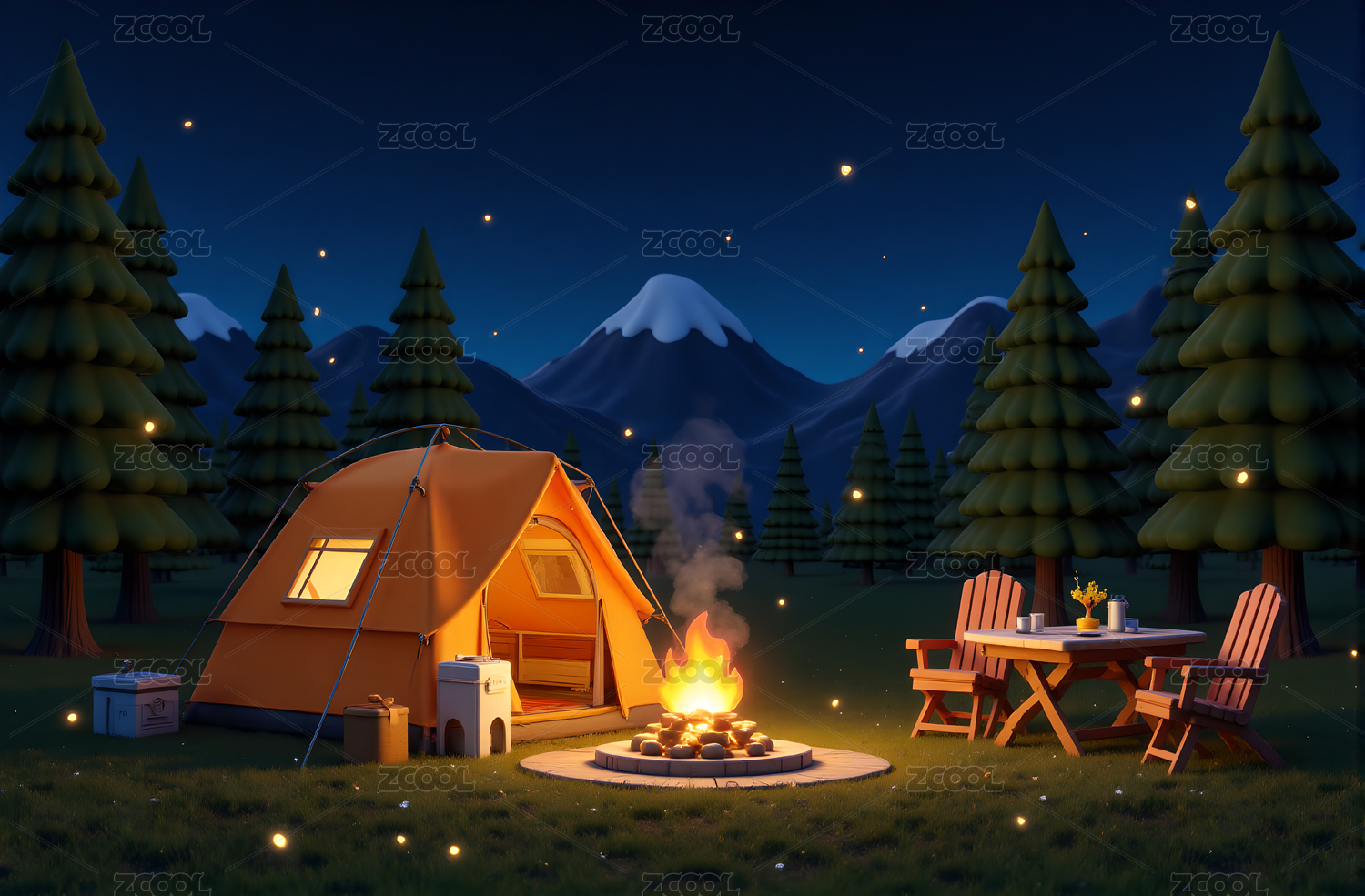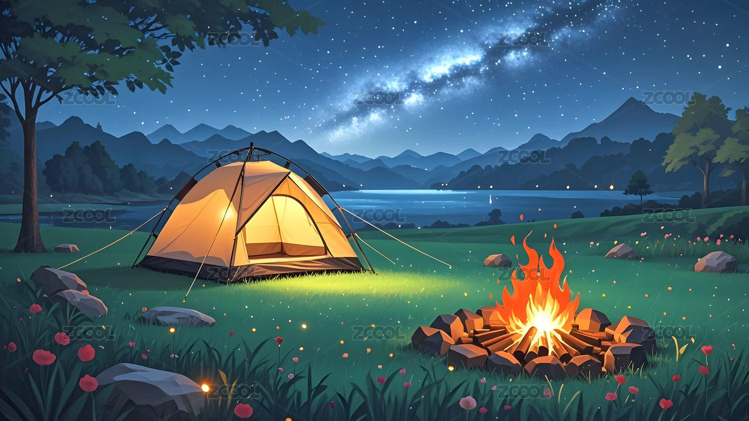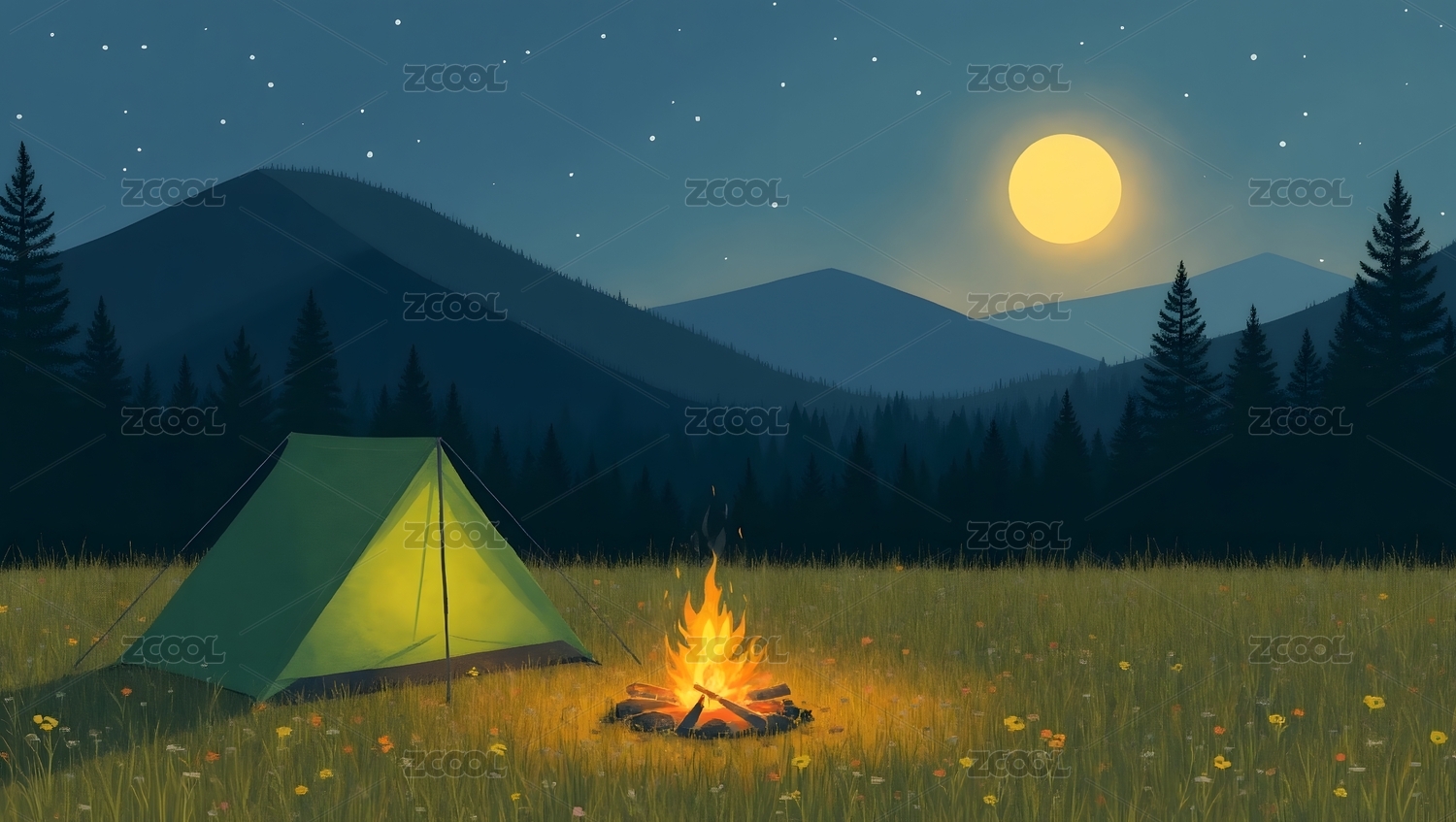 明亮的月光下,帐篷旁燃起温暖的篝火