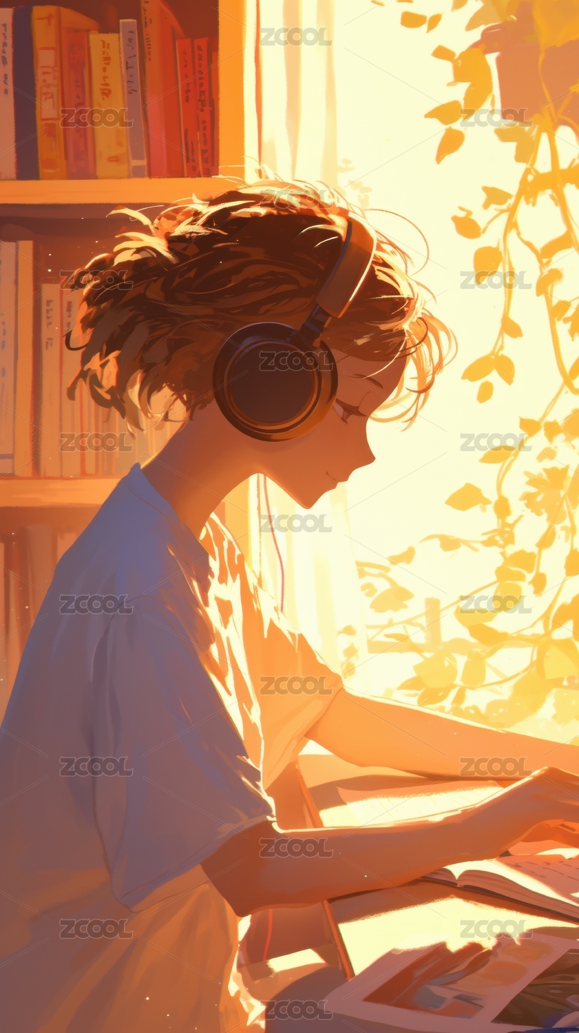 水彩,唯美,人物,男孩,绘画,插画,可爱,耳机,听歌