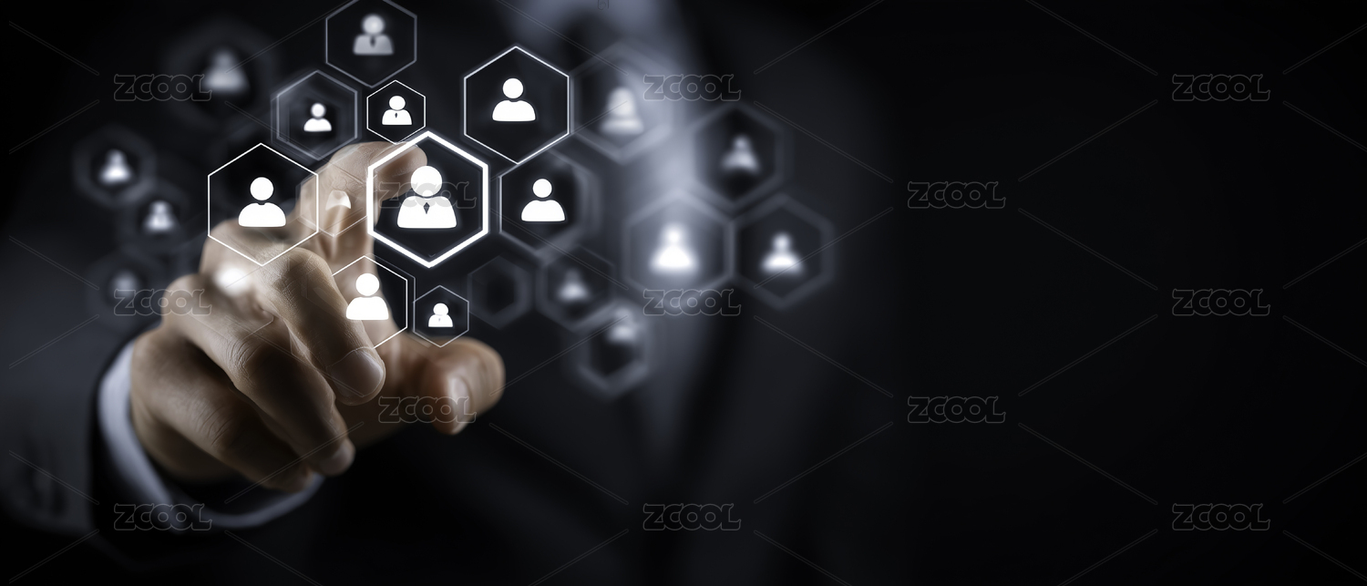 一个商务老板用手点击着用户进行招聘选择和公司的管理