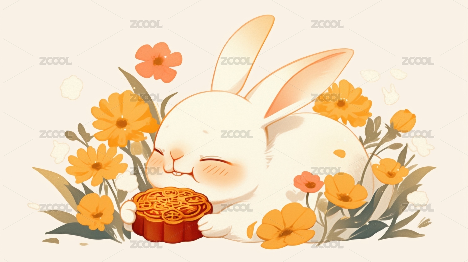 兔子与月饼花丛中的温馨场景
