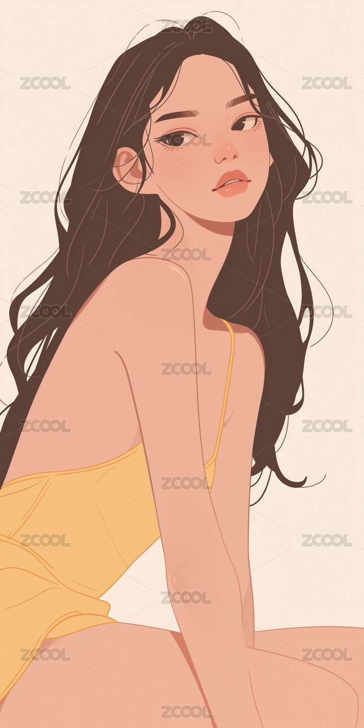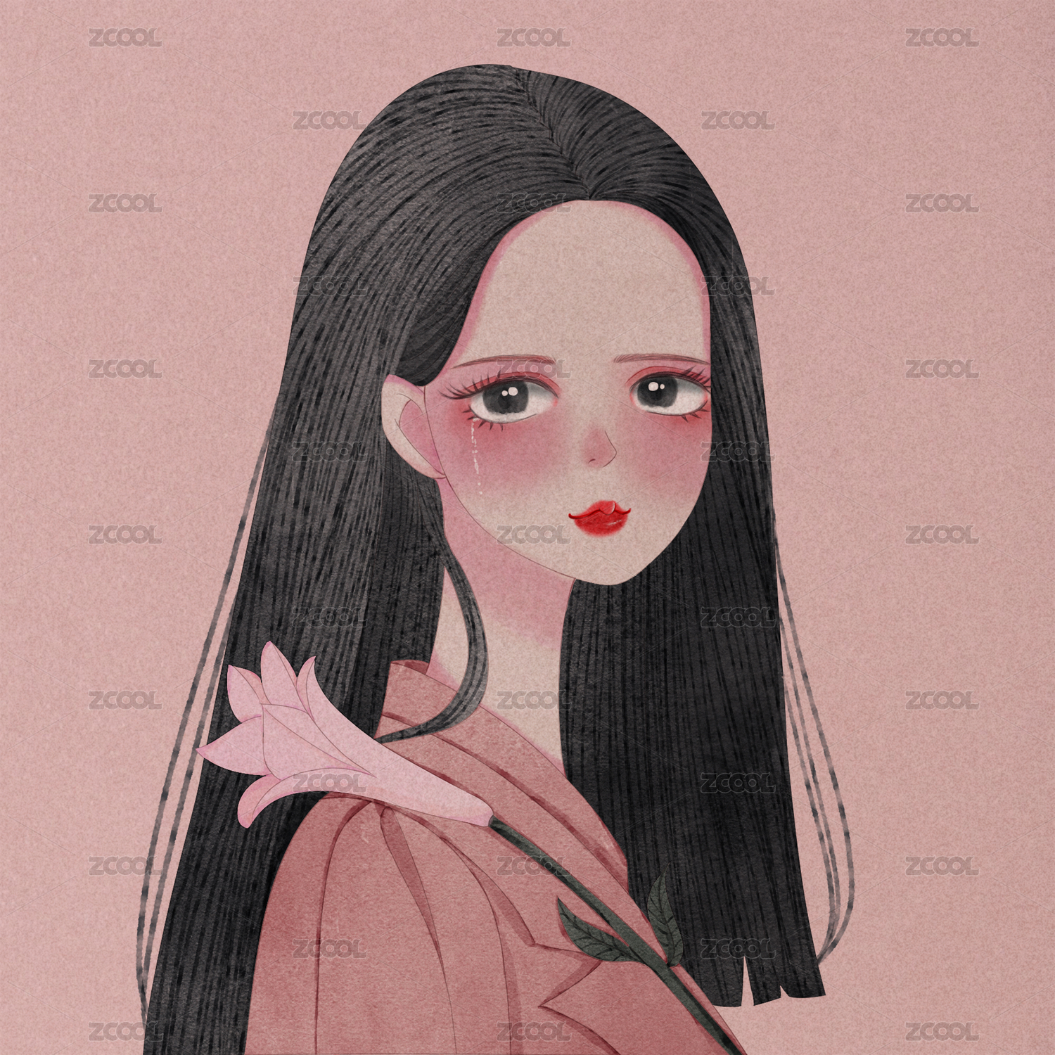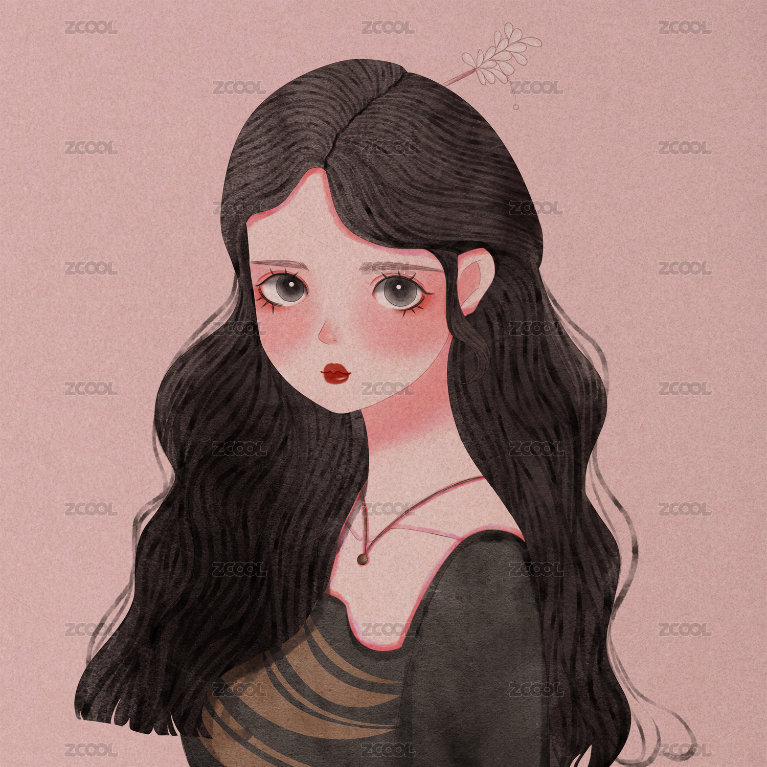 夏天黑头发黄皮肤东方女性头像扁平插画绘画
