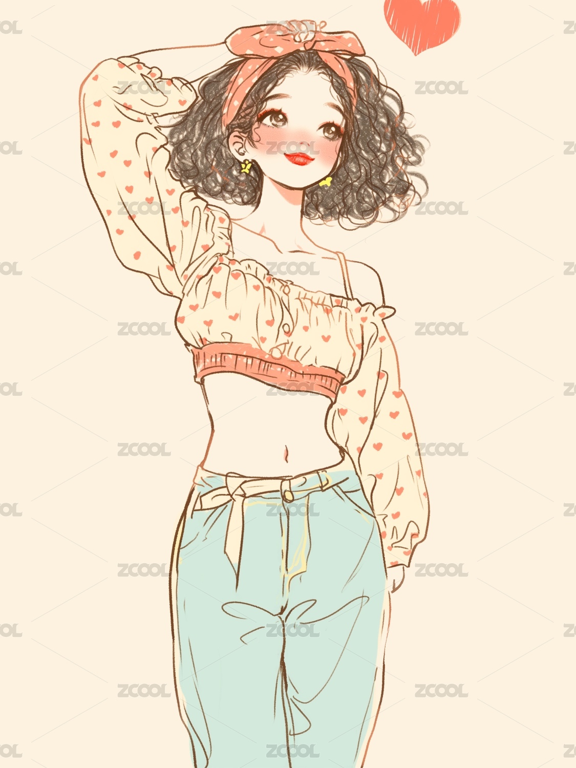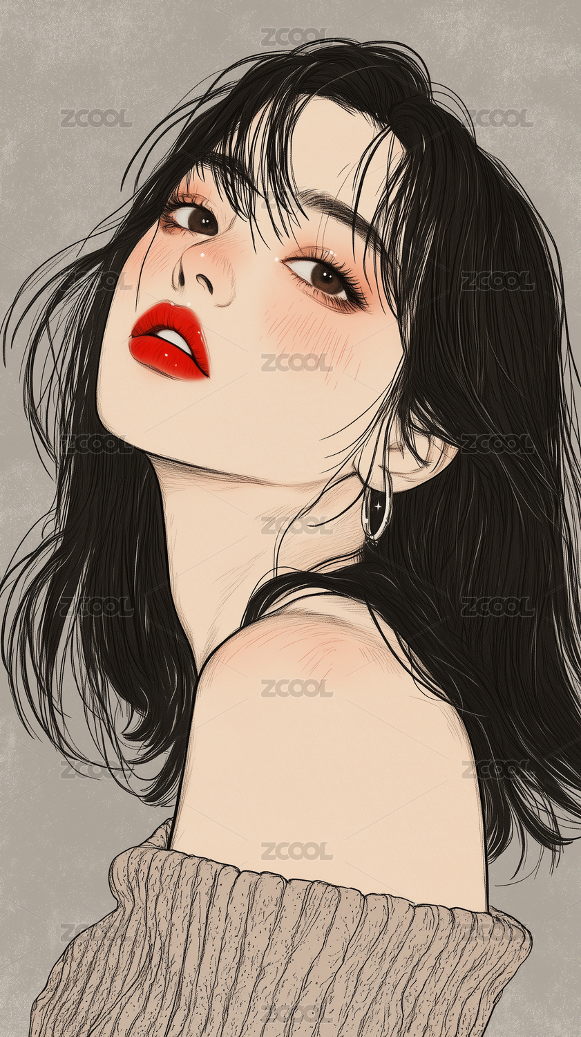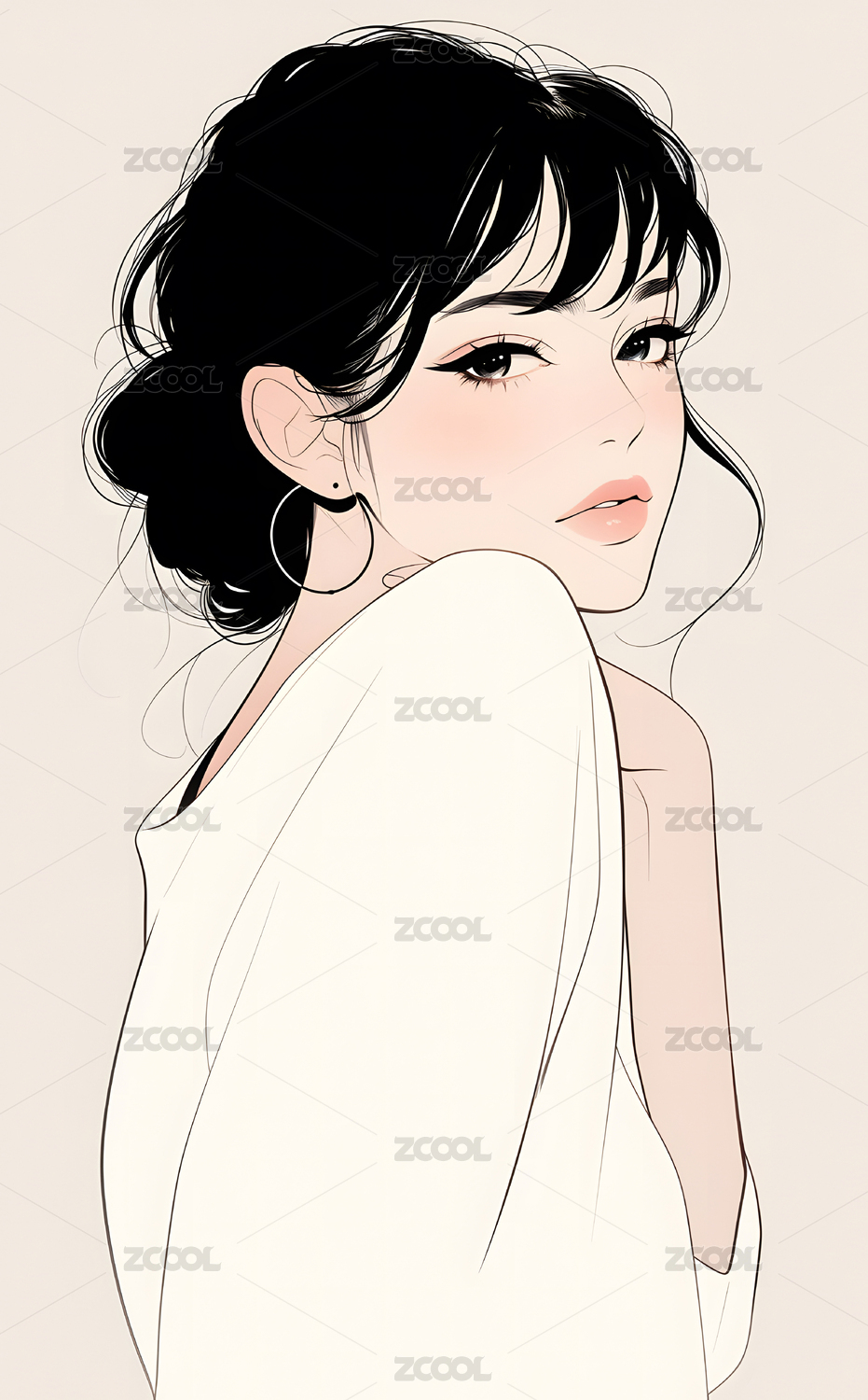 夏天黑头发黄皮肤东方女性头像扁平插画绘画