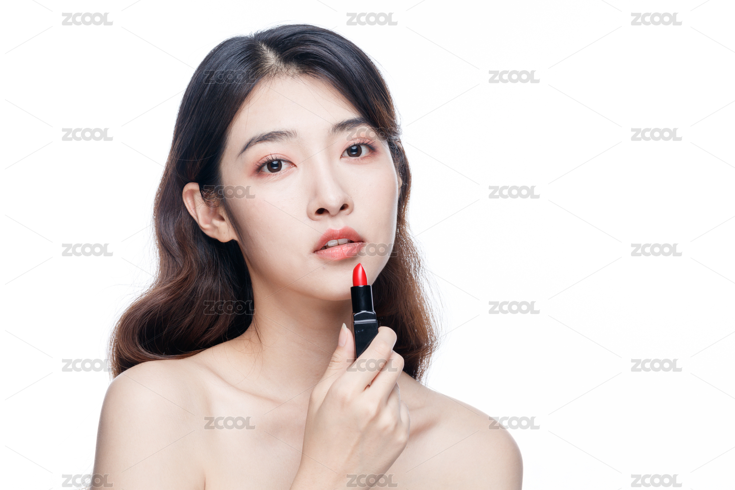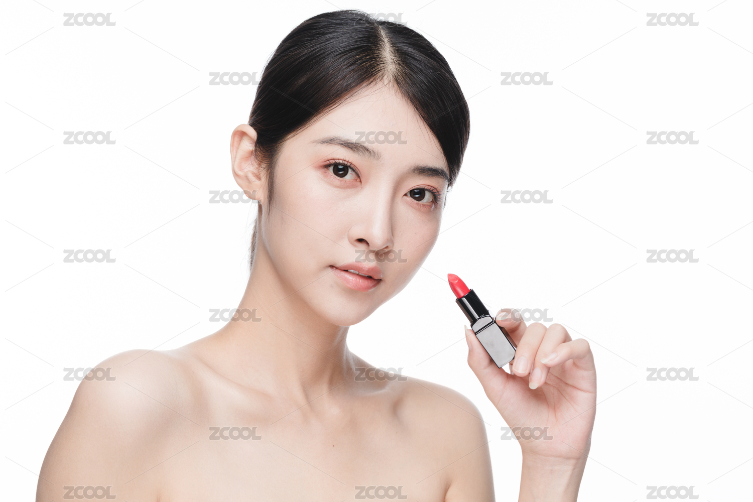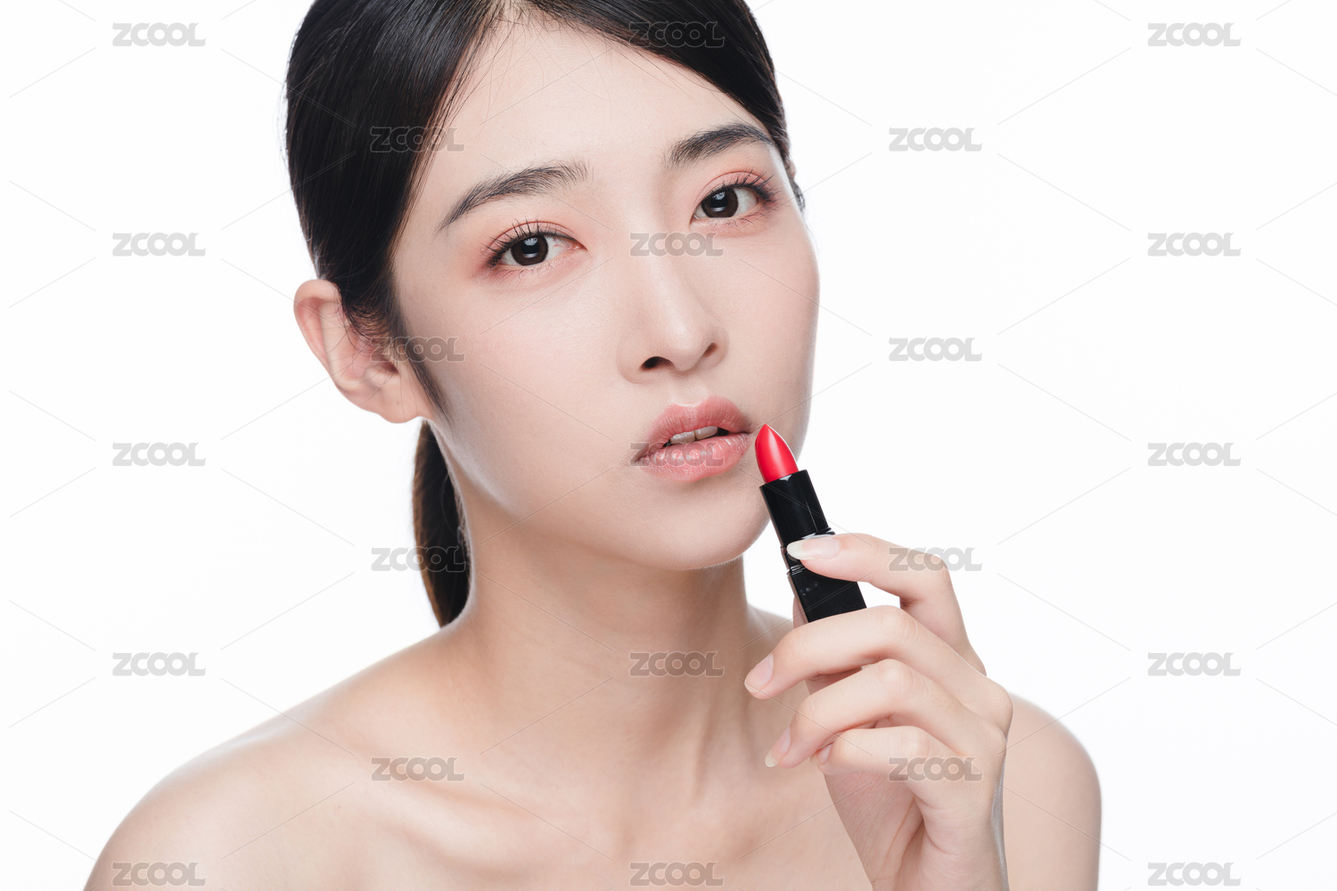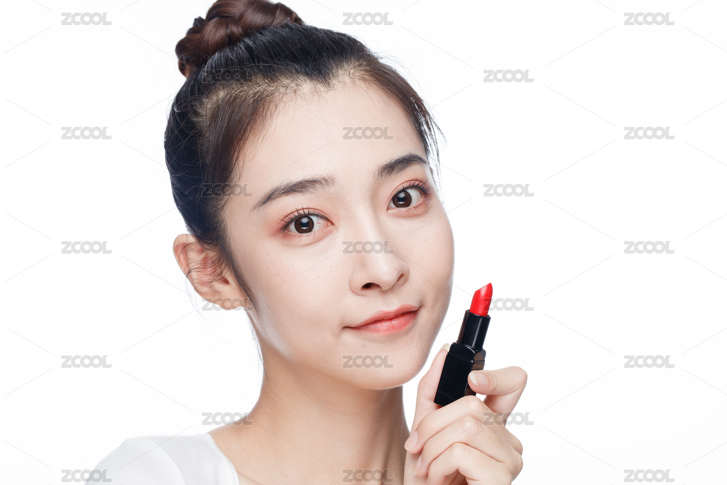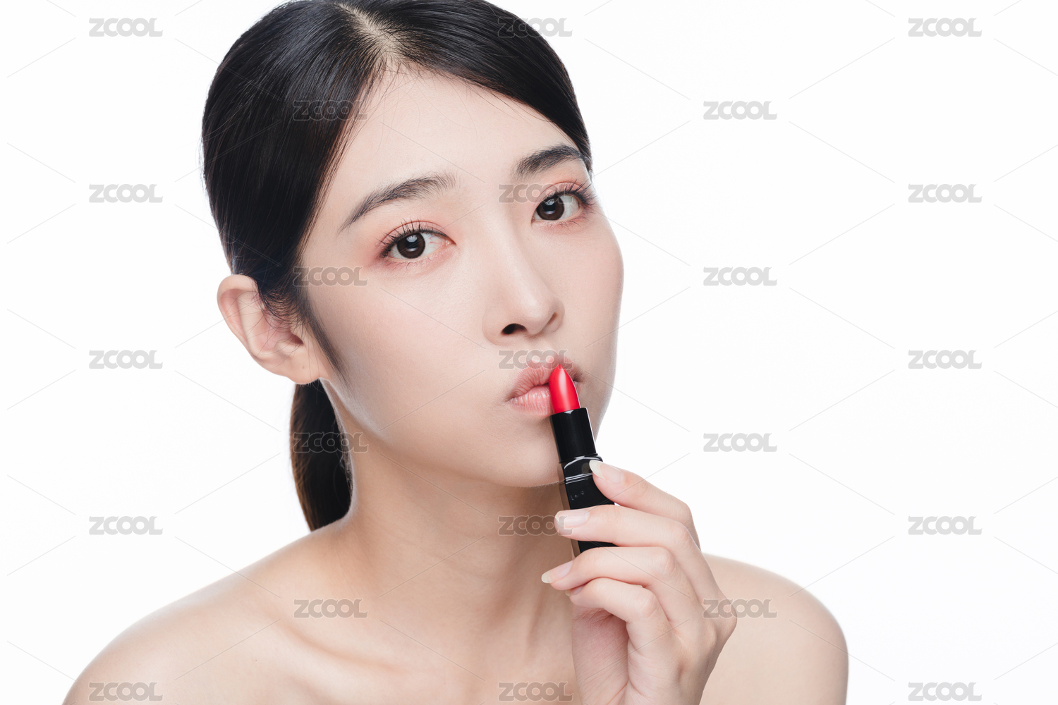 漂亮的亚洲美女涂口红白色背景半身肖像