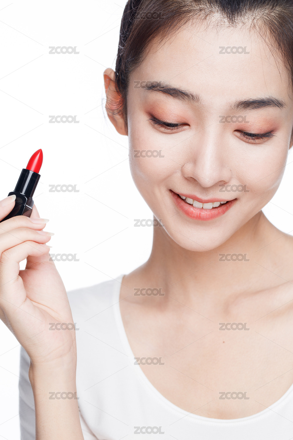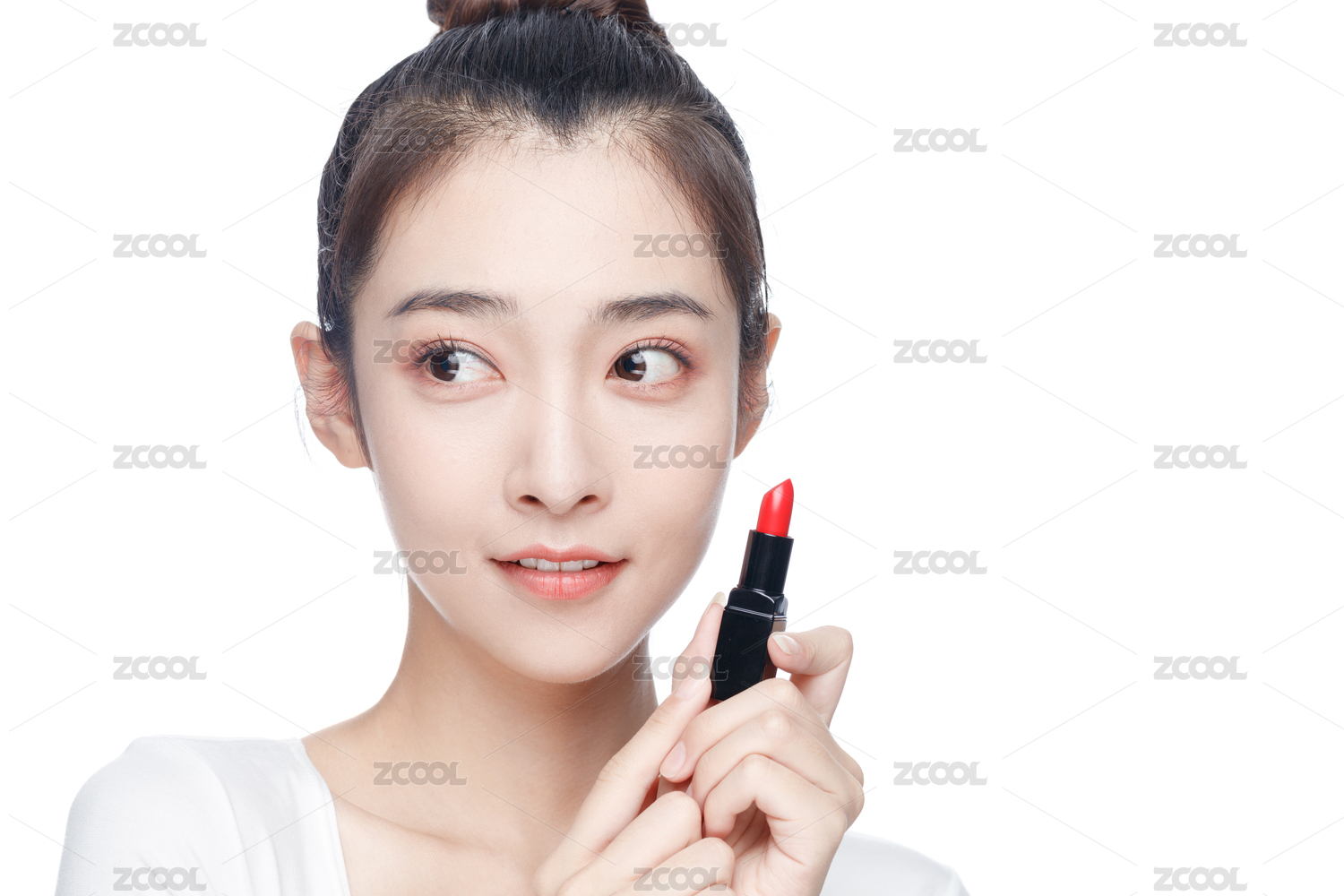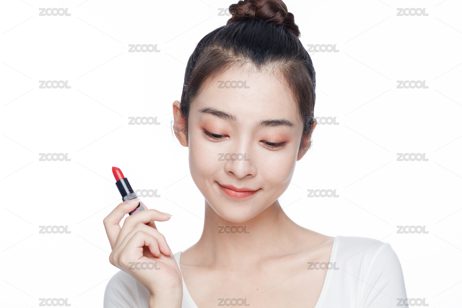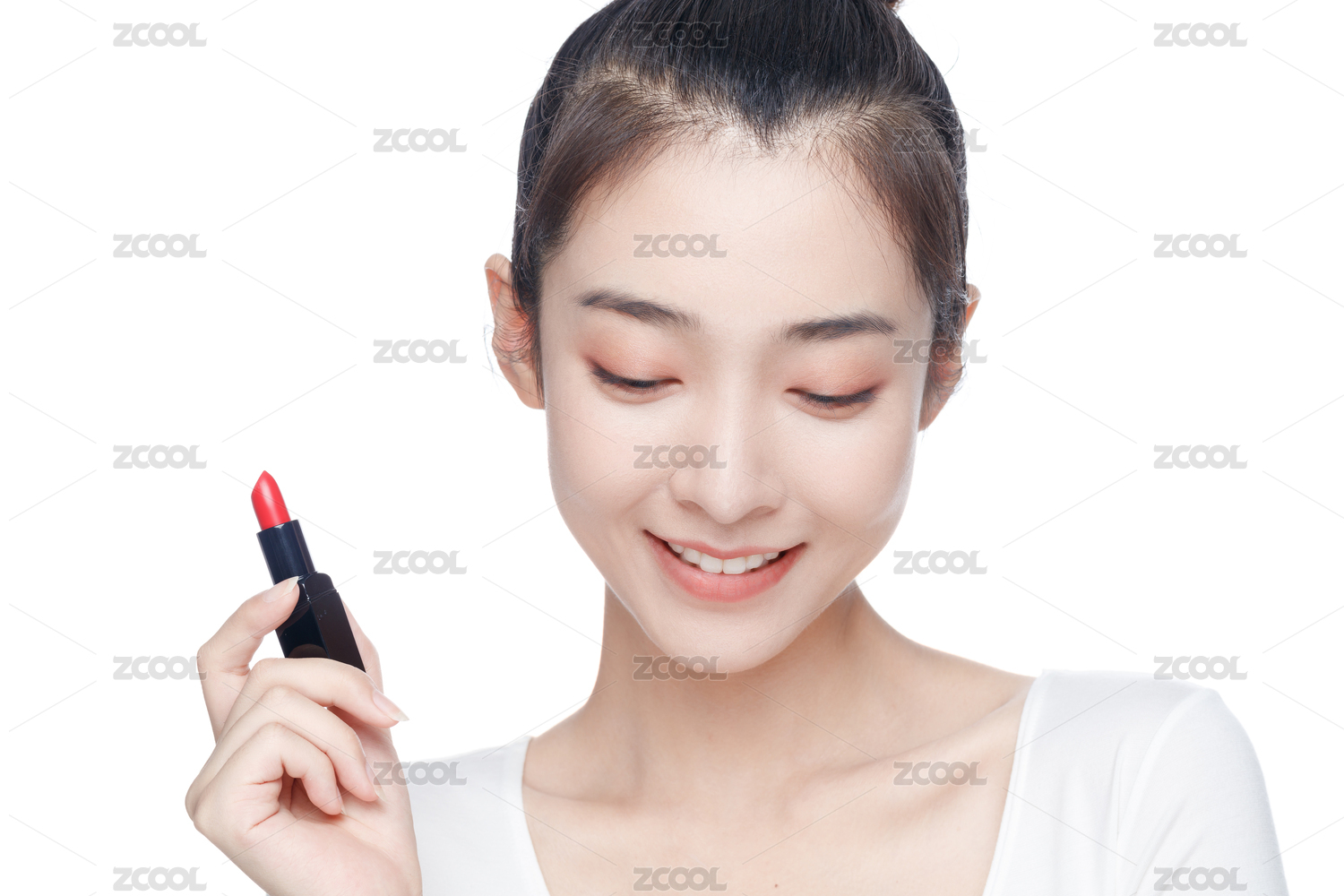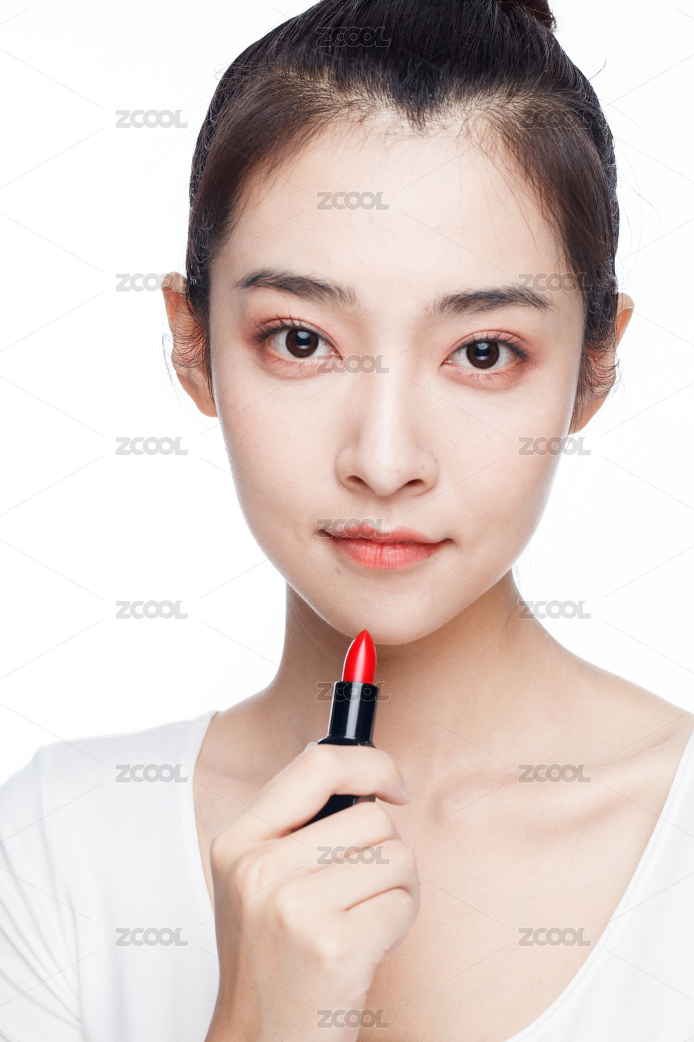漂亮的亚洲美女涂口红白色背景半身肖像