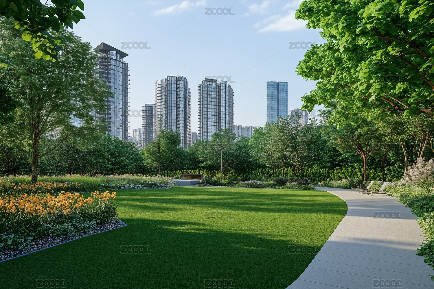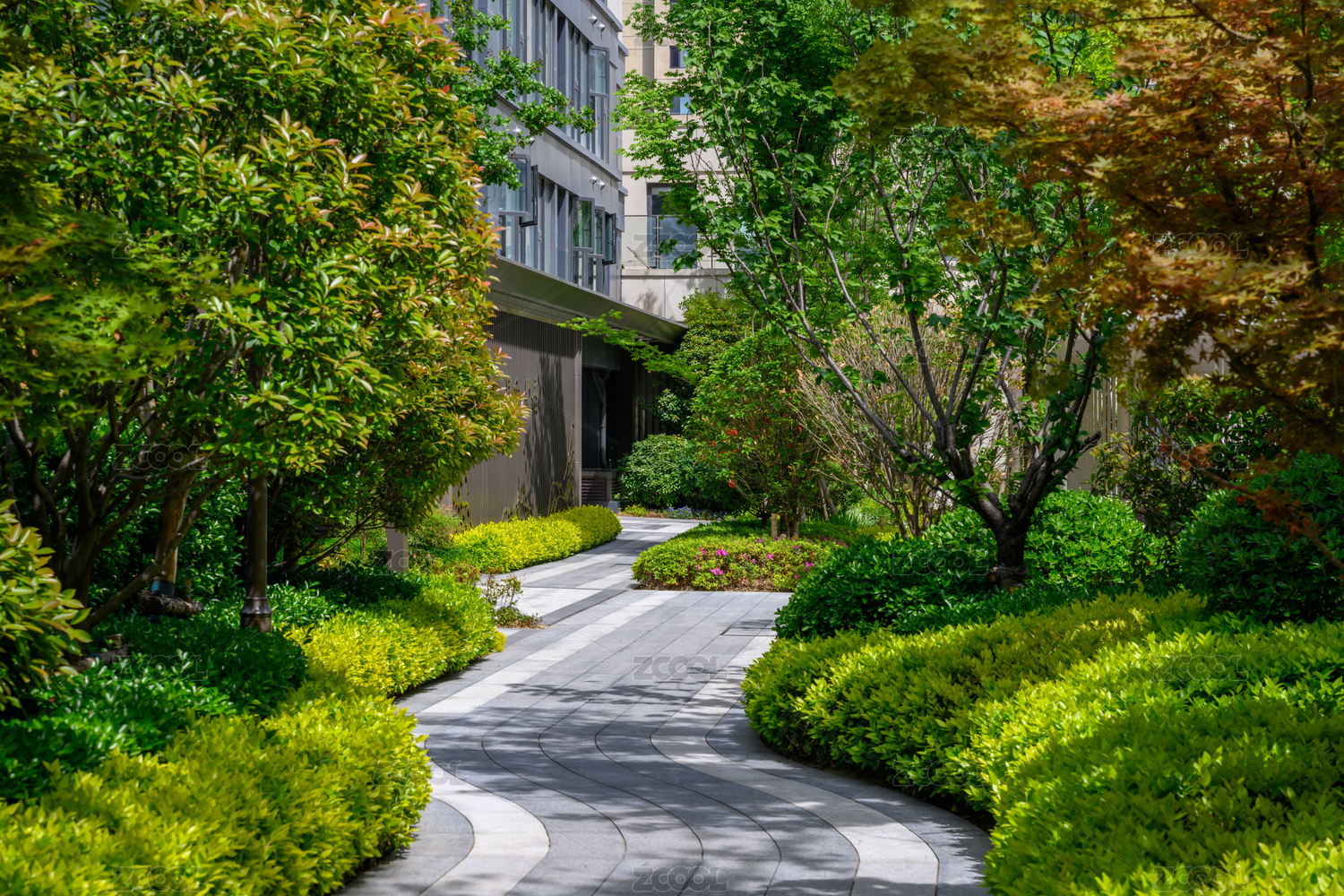 小区住宅里弯曲的步行道,砖路边绿色草坪,园林景观设计