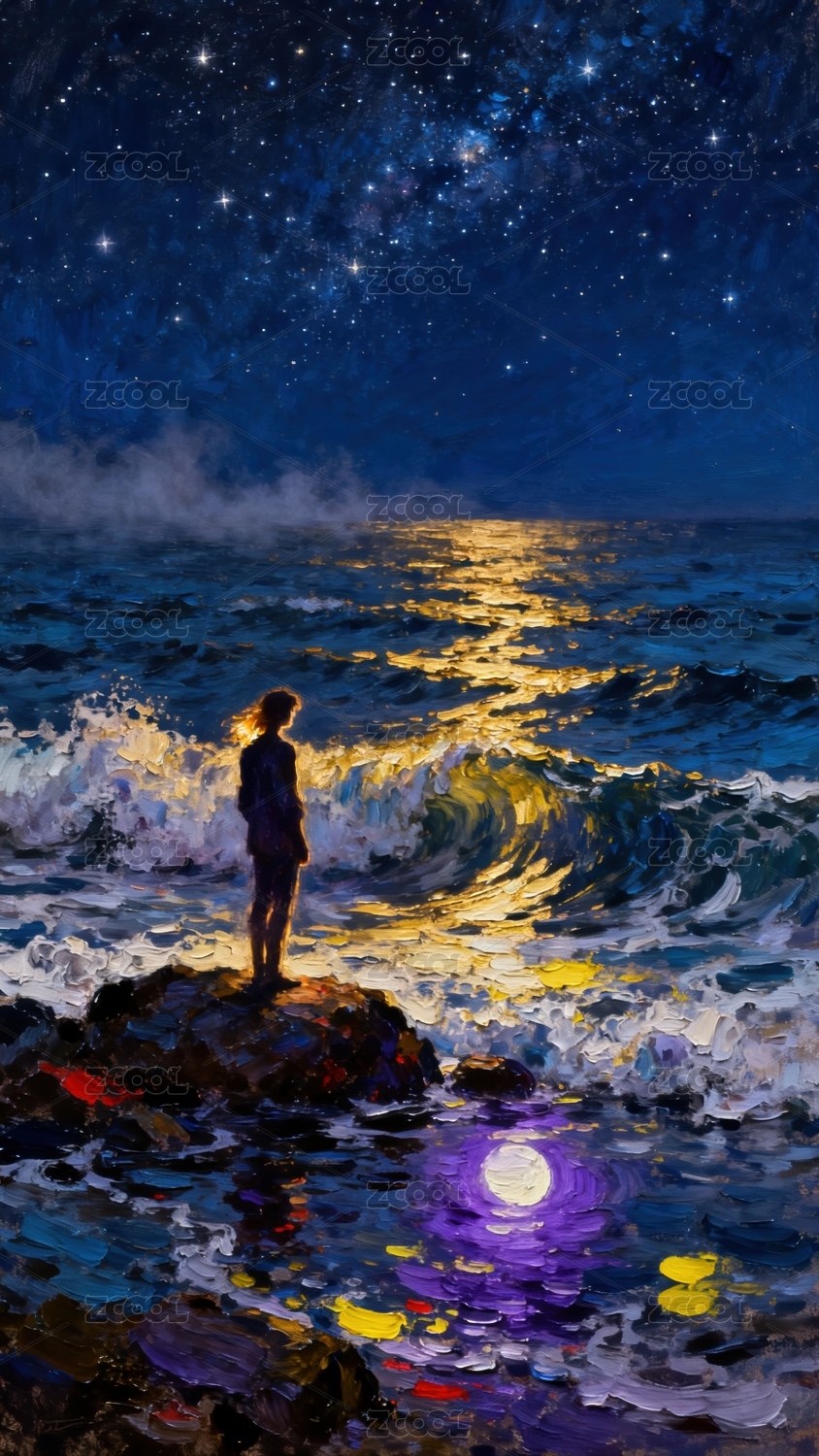 夜晚穿白裙子的女孩坐在月亮上钓星星