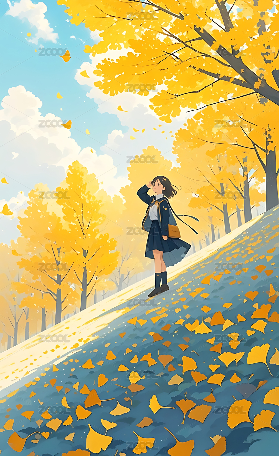 秋天,枫叶,金黄色调,人物,帽子,壁纸,插画,立秋,落叶,背包