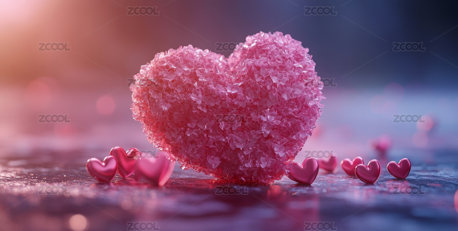 一颗晶莹剔透的红色爱心在盛开的花朵中