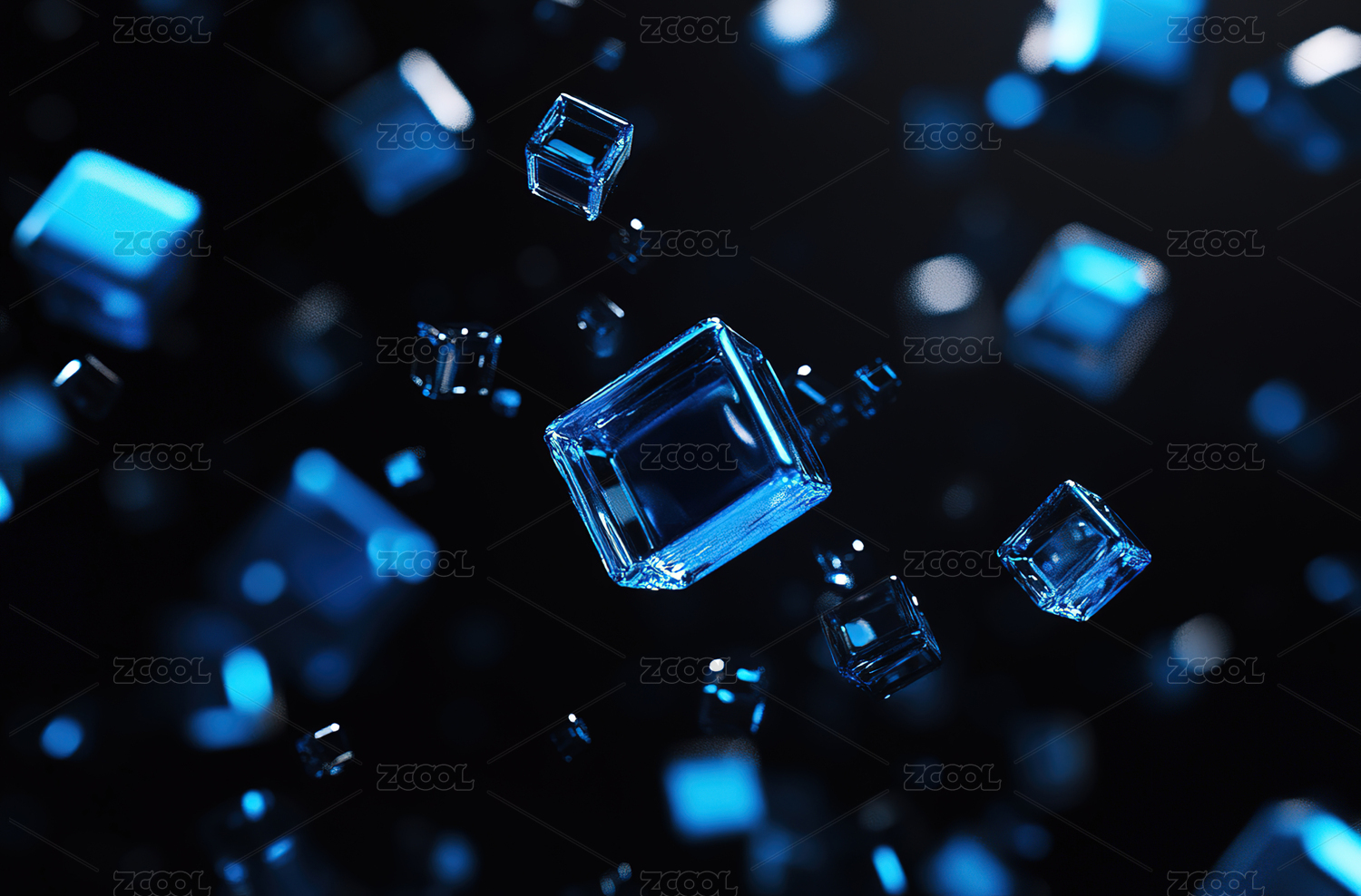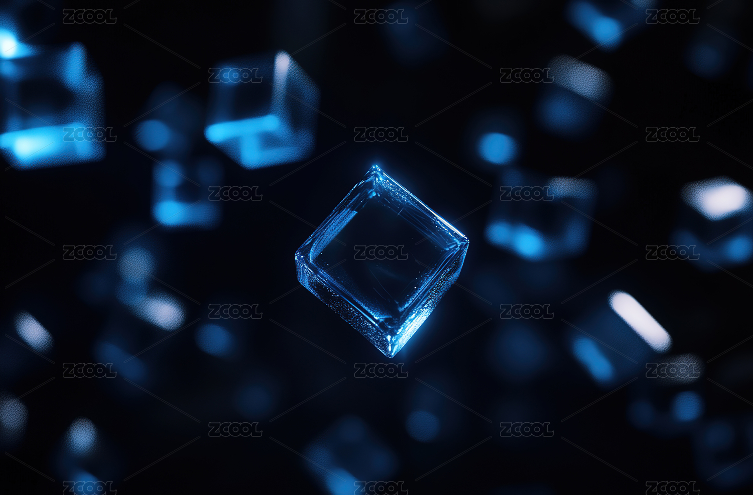 蓝色透明立方体悬浮在黑暗背景中