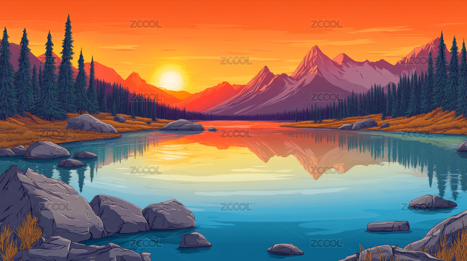 山间湖泊风景插画