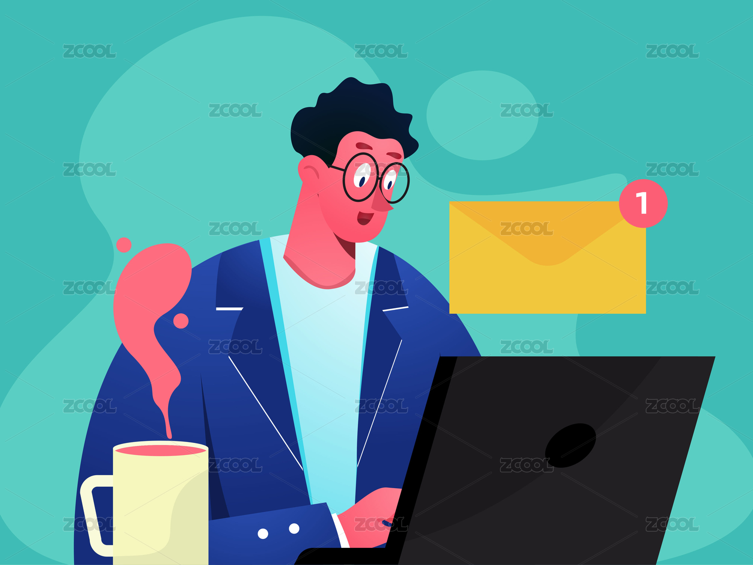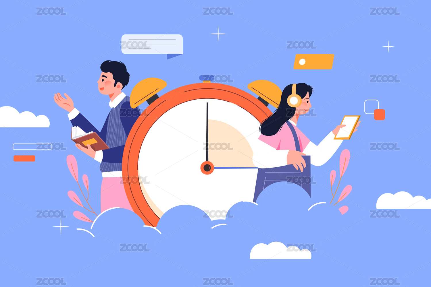 男士在电脑面前工作旁边放着闹钟矢量插画