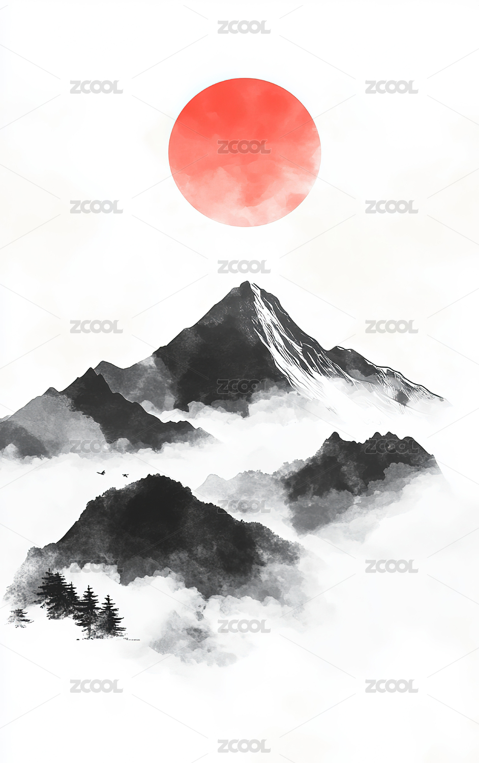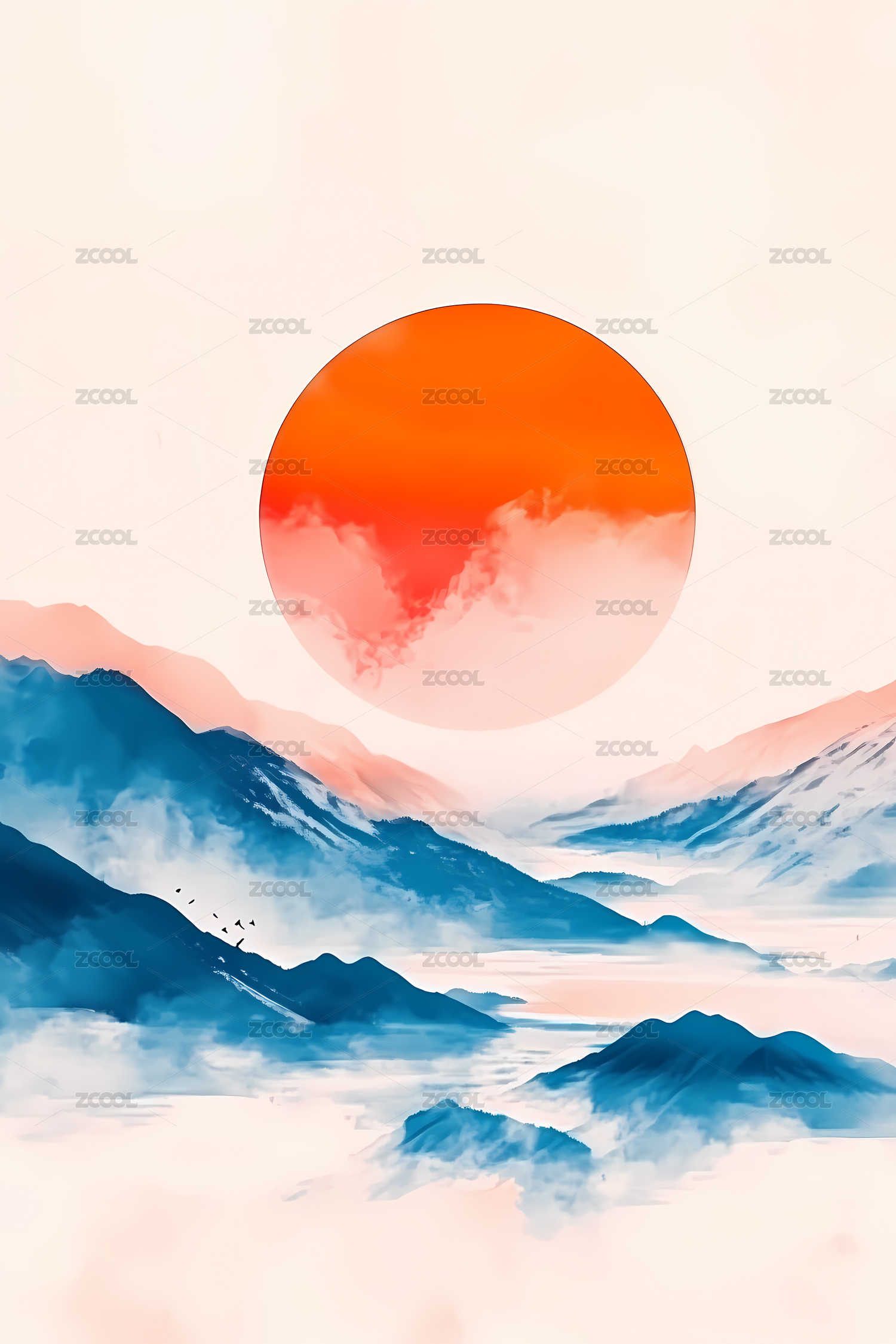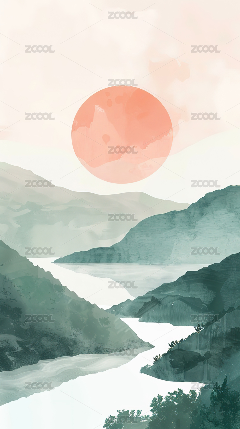 唯美山脉风景水墨插画