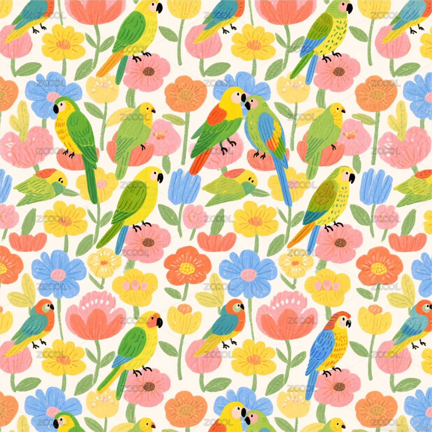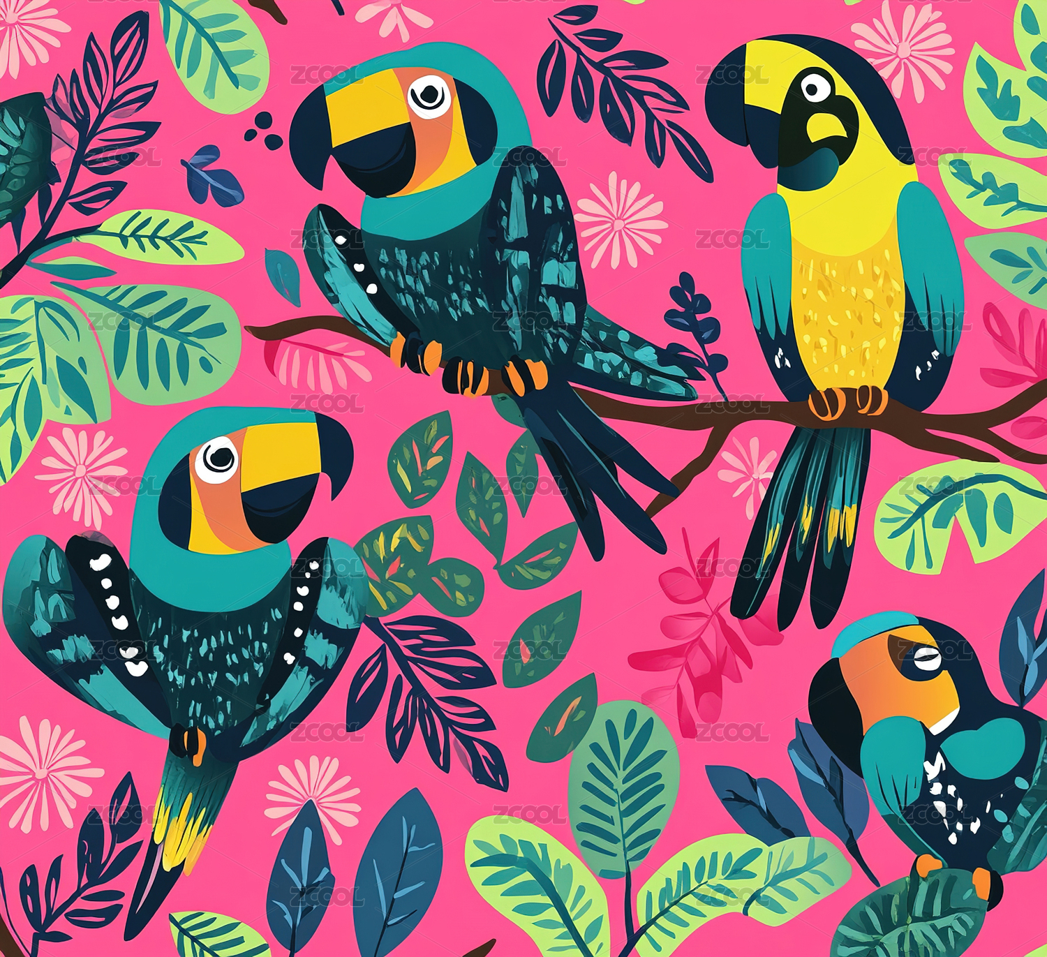 鹦鹉无缝平铺四方连续纹样图案背景