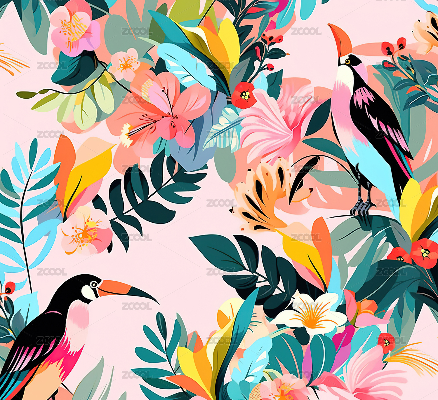 热带鸟类和树叶的生动插图