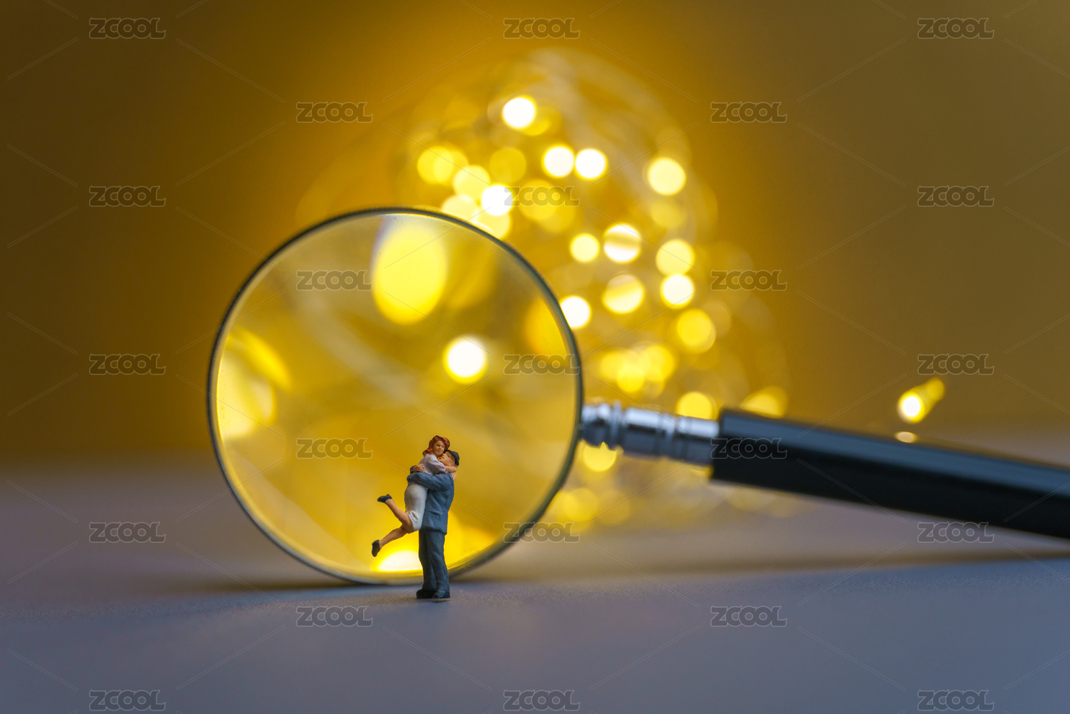梦幻灯光背景中站在放大镜旁拥抱的恋人微缩