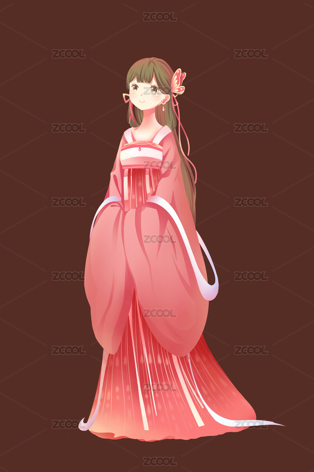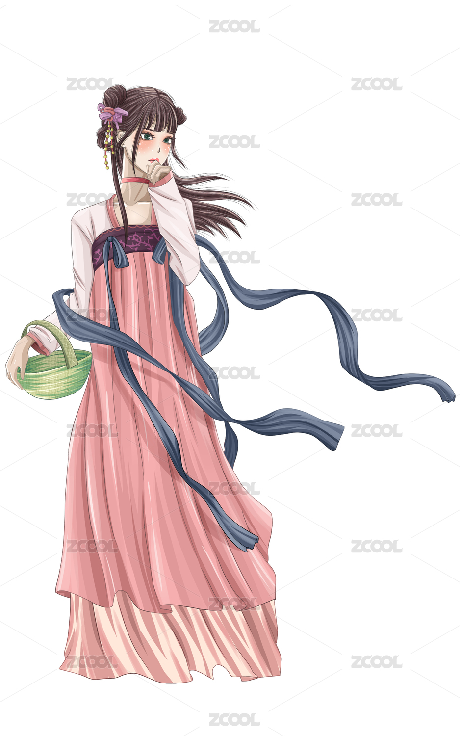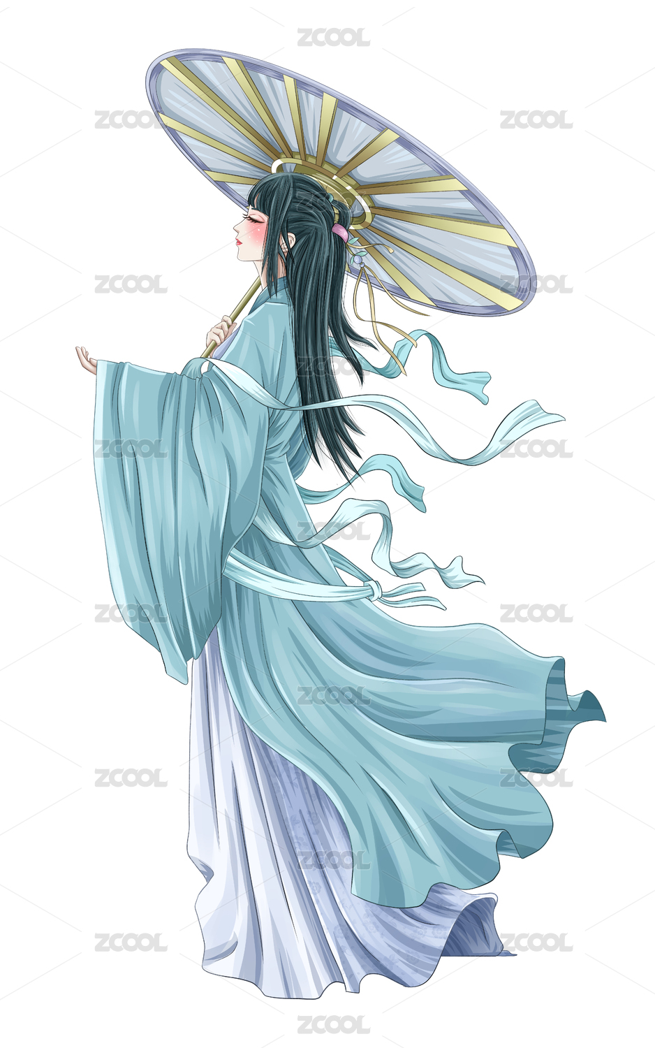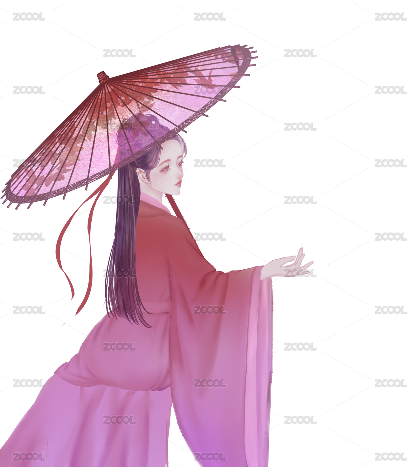 手绘插画 穿着汉服带着面纱的长发少女举着纸伞