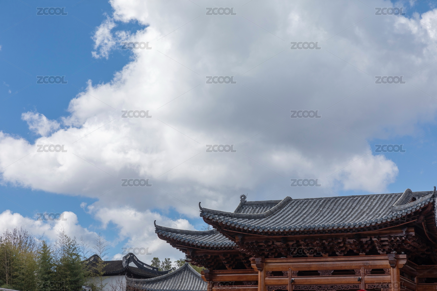 中式园林中传统房屋建筑屋脊上飘着的白云