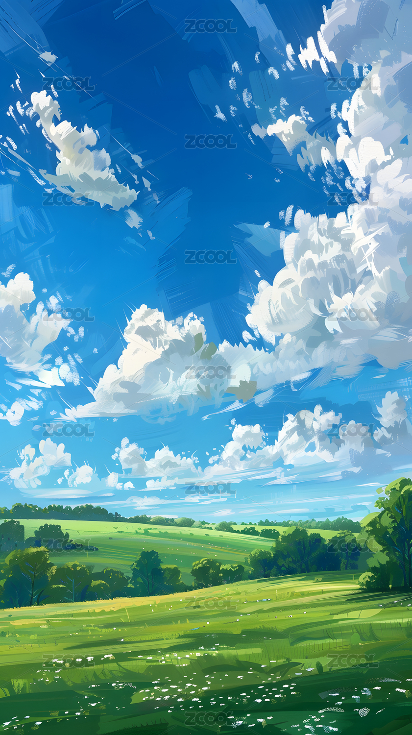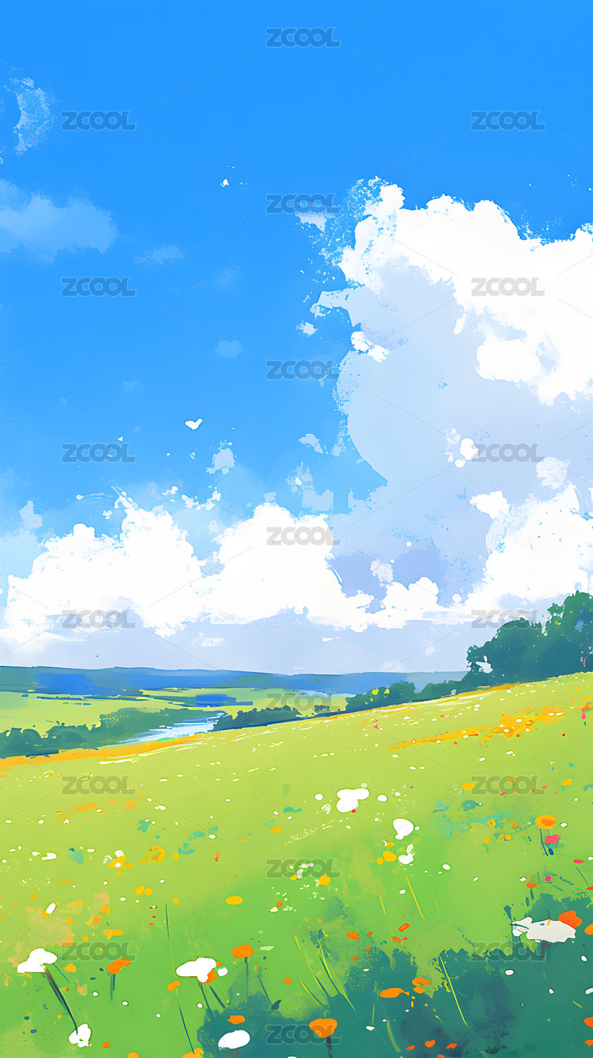 蓝天白宇你绿色草地背景插画
