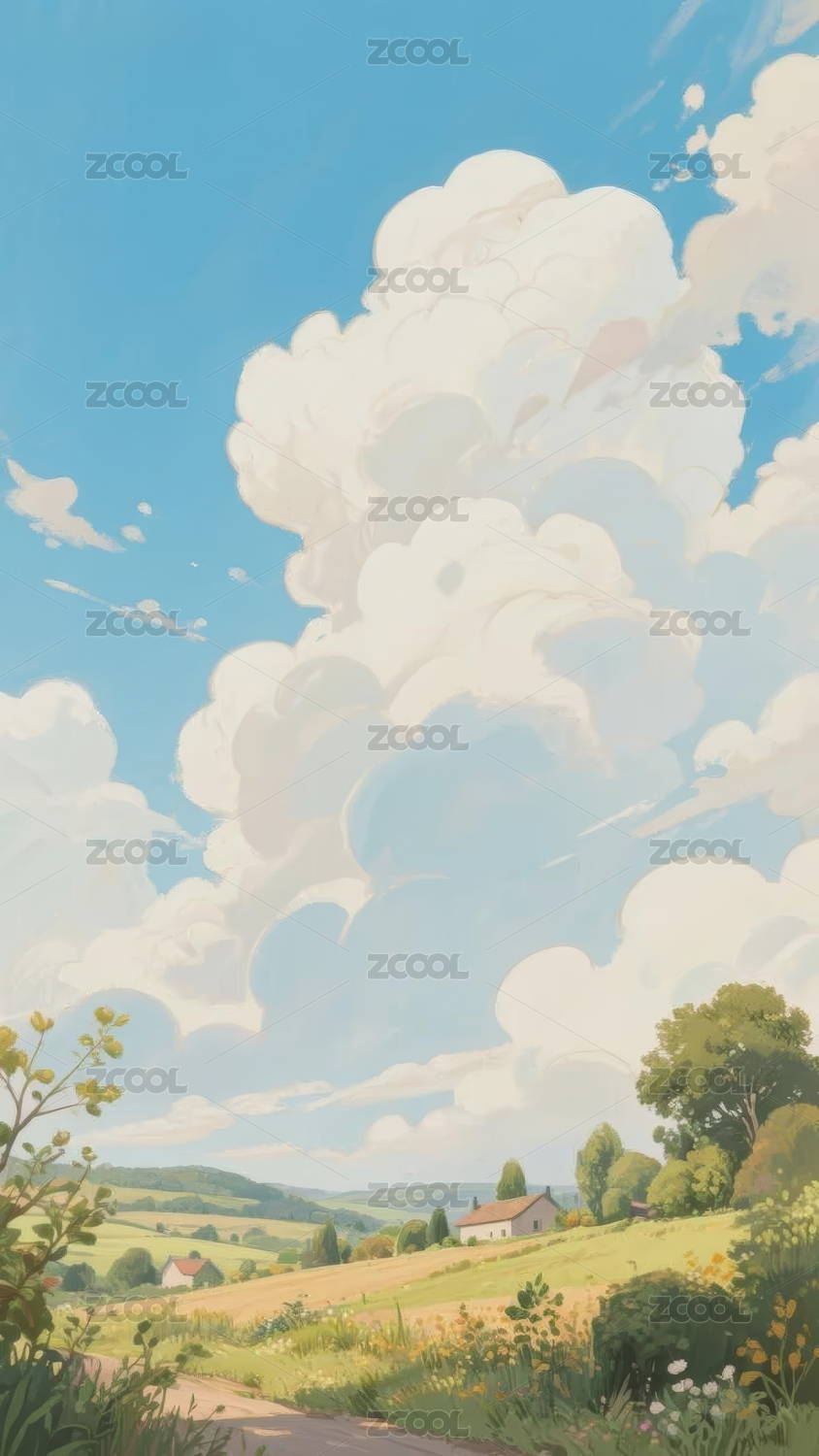 郊外,春天,蓝天,白云,山,树,草地,庄稼,村庄,插画