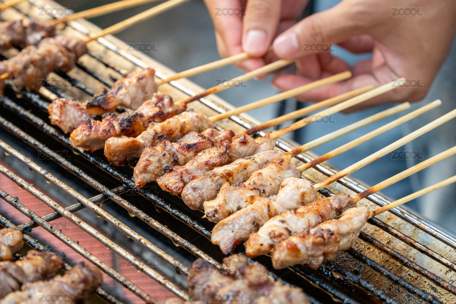烧烤,烧烤炉,烤制,五花肉串,猪肉,鸡肠,牛肉串,美味,小食,小吃