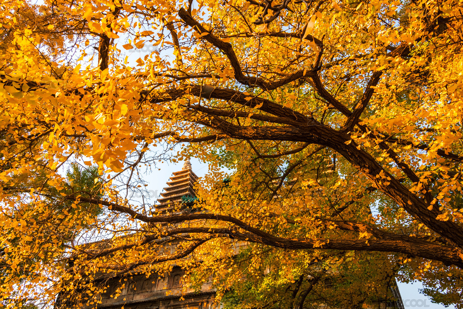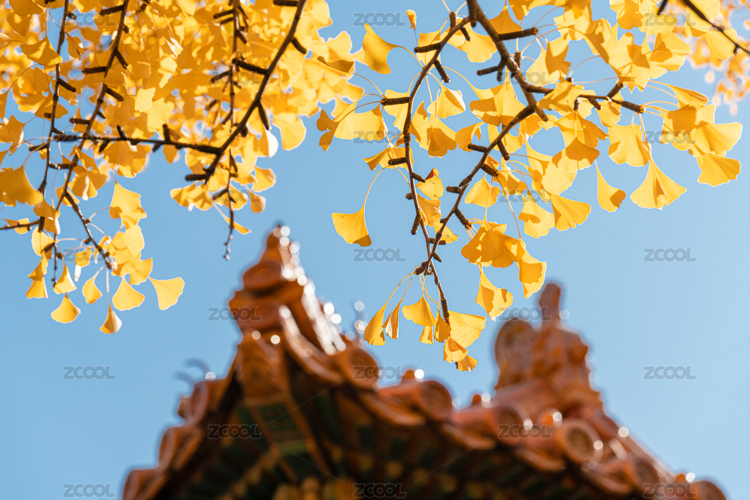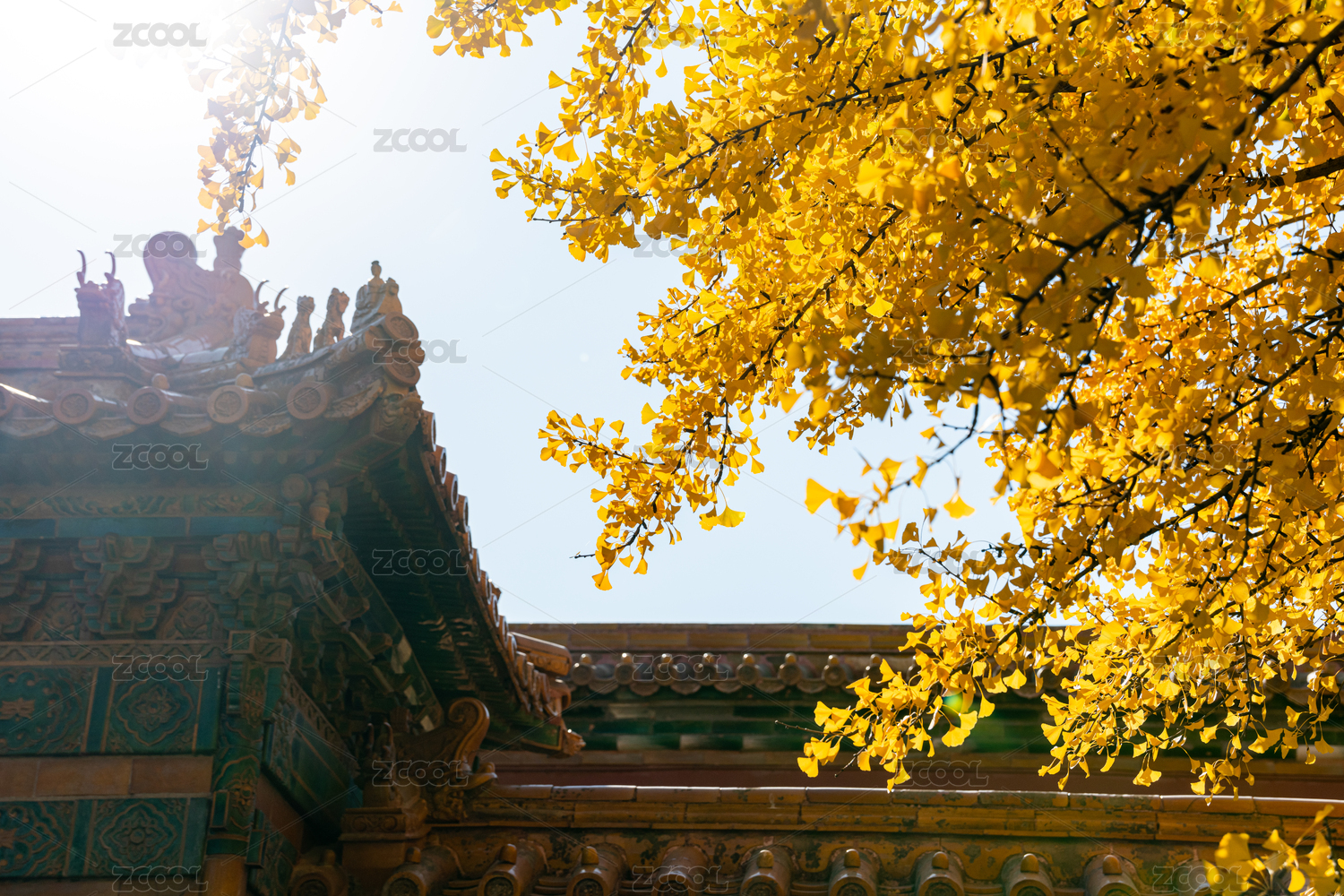 秋日阳光中金色银杏树叶掩映下的故宫角楼