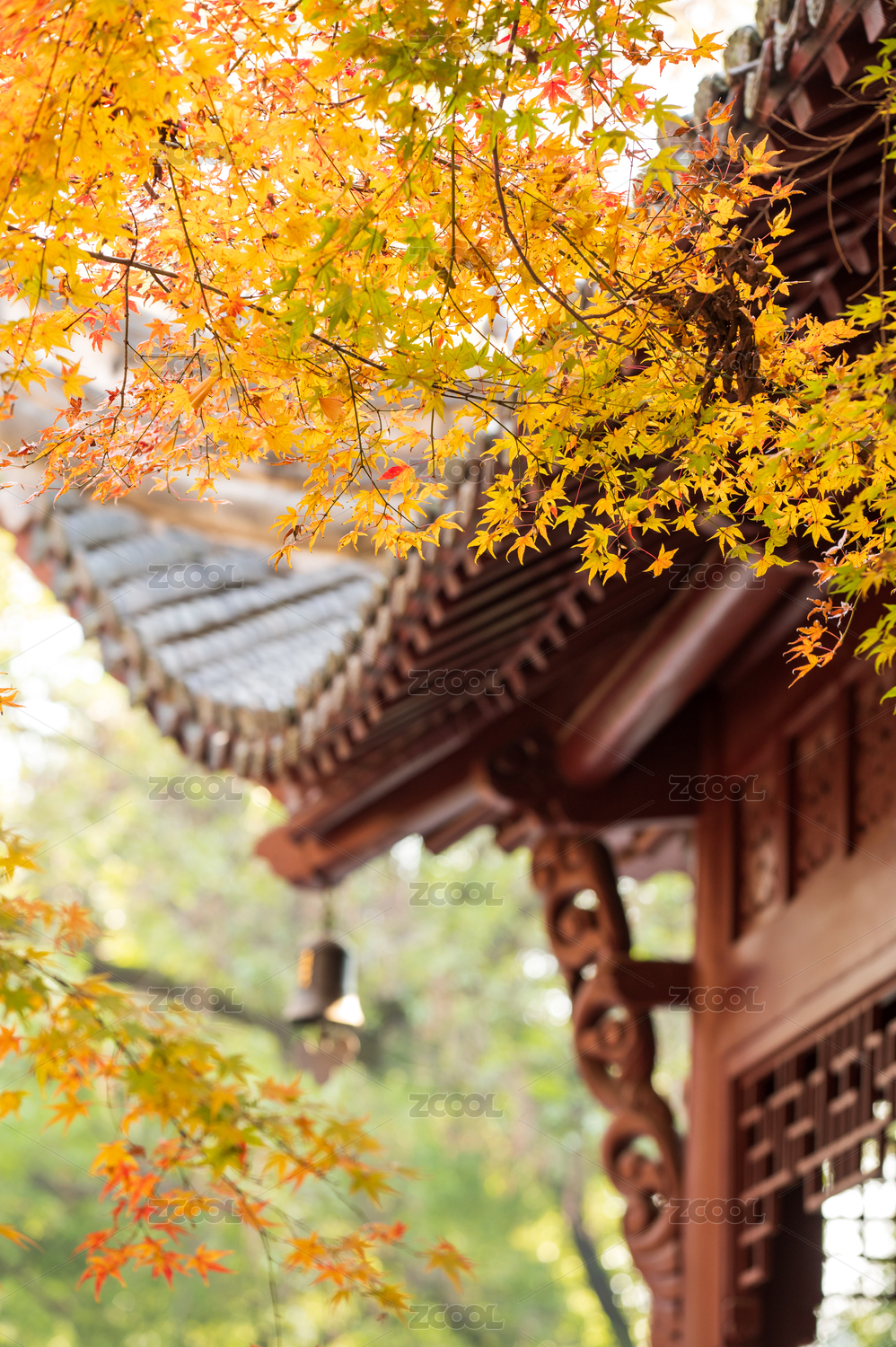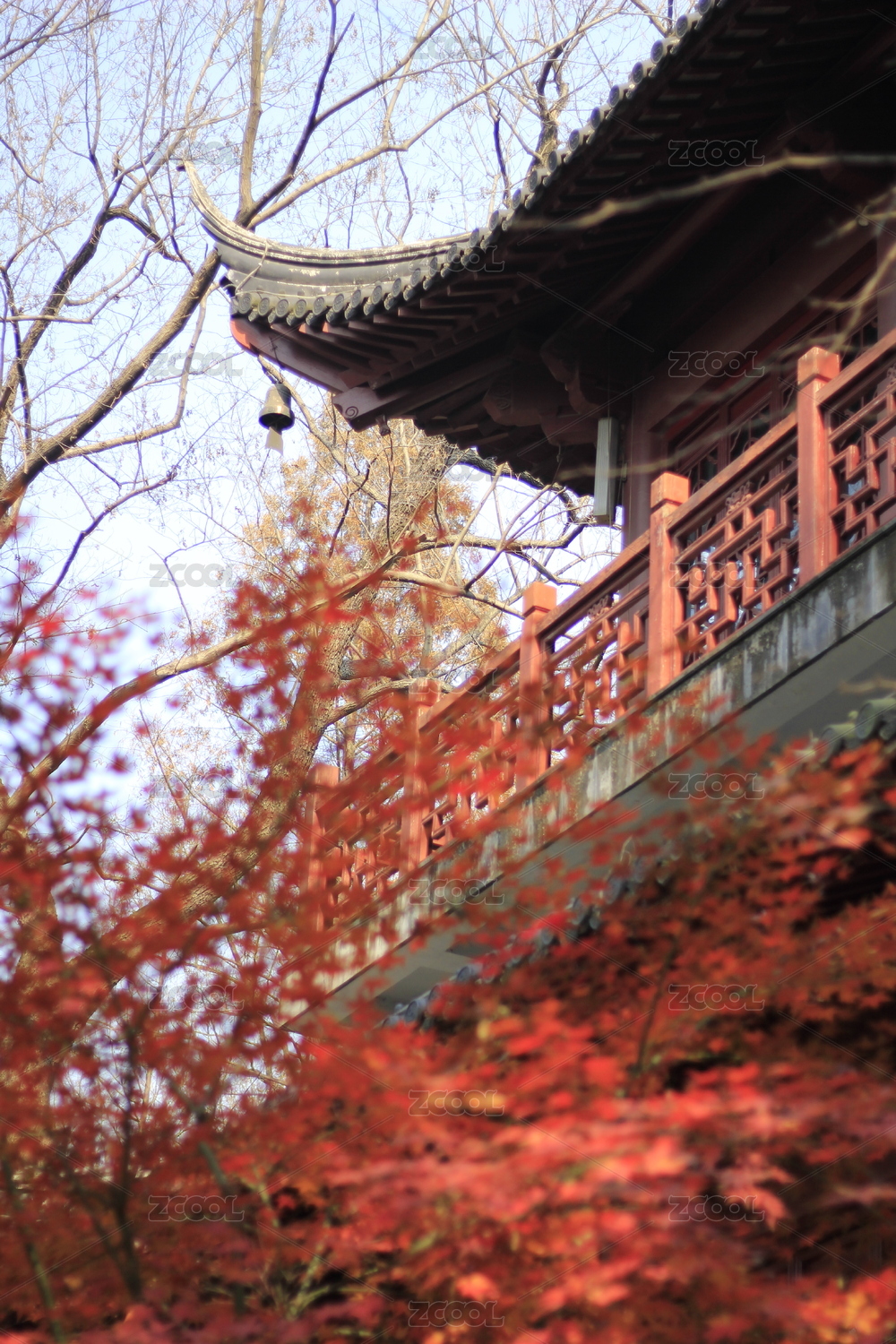 仰拍中国江苏南京栖霞山的红色落叶与古建筑交相辉