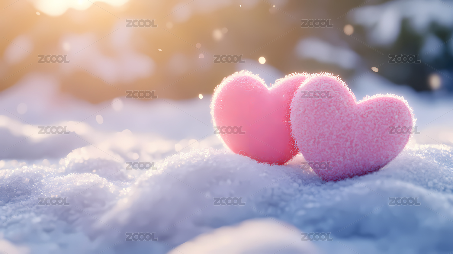 粉色蓝色爱心在雪地中闪耀