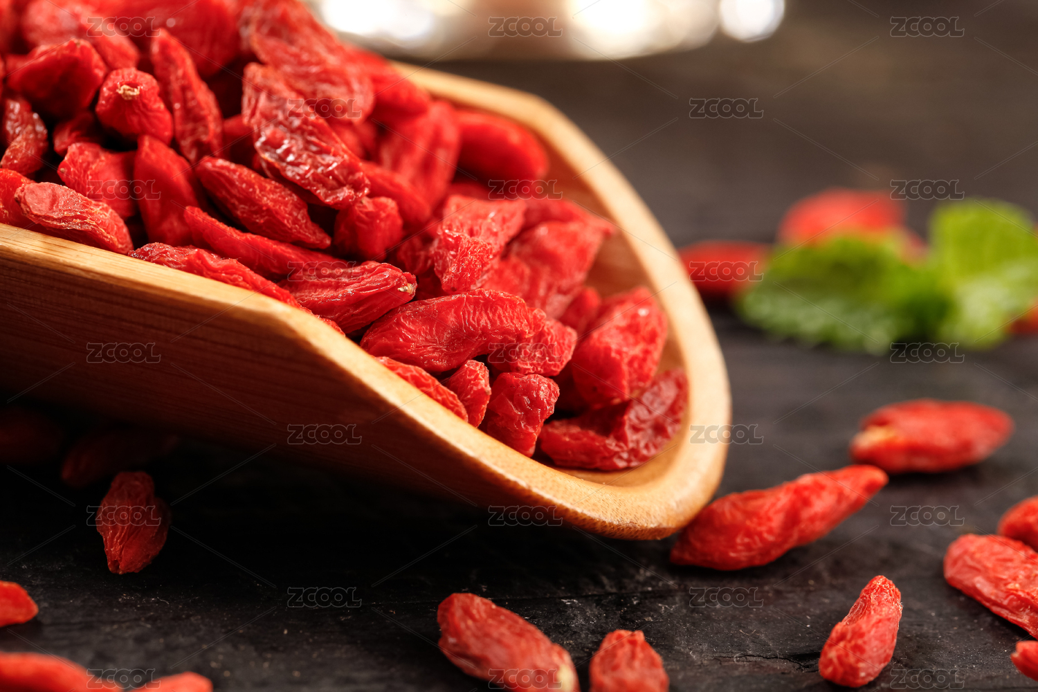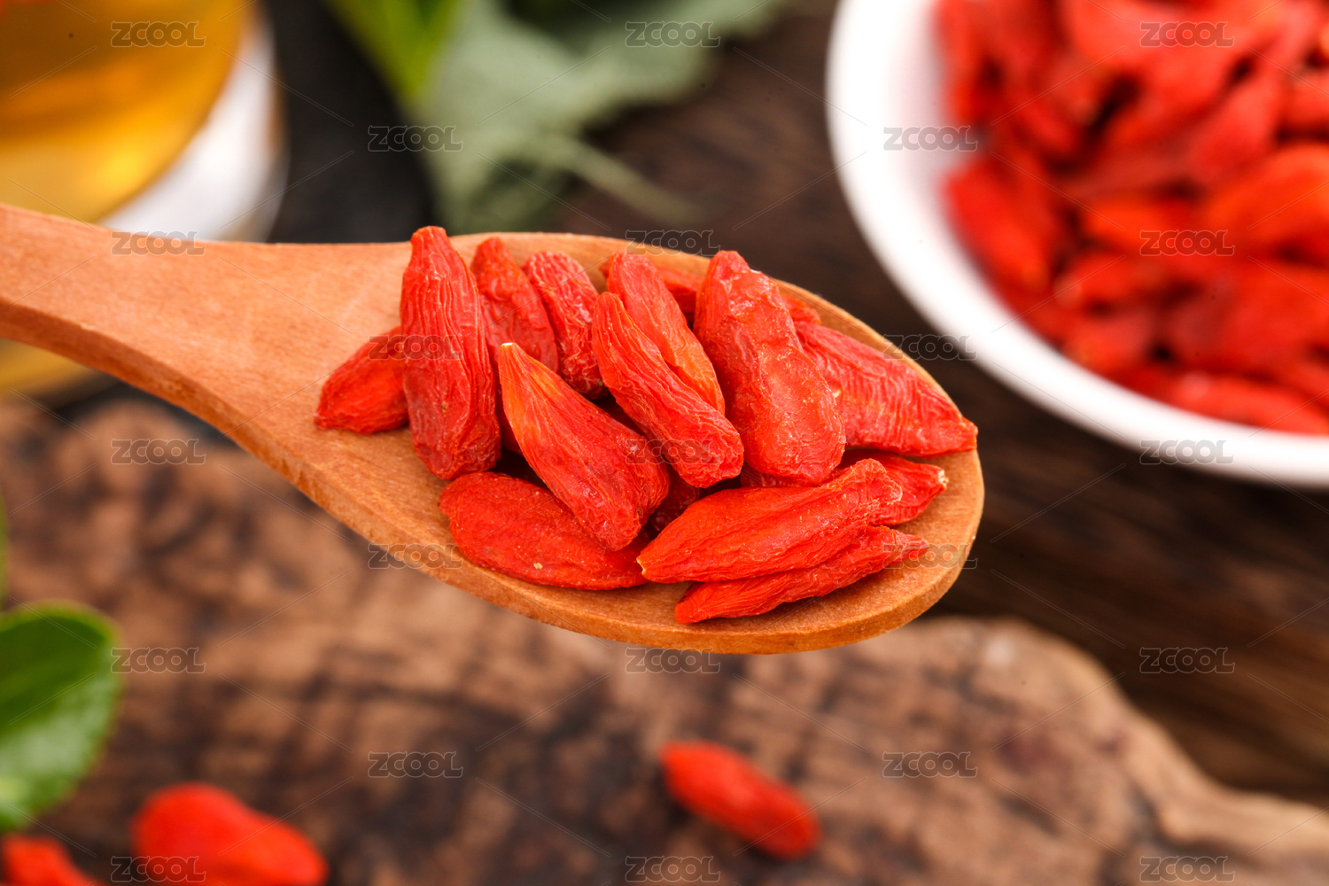 木板上勺子里放着红枸杞