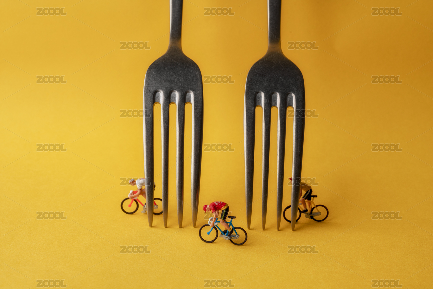几个骑行的人穿梭在叉子之前的微缩创意图
