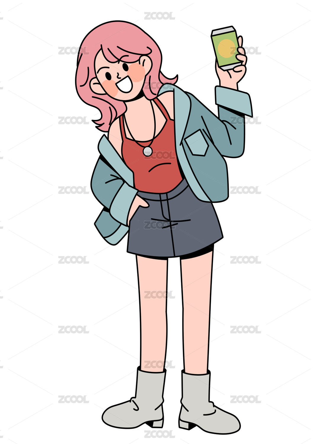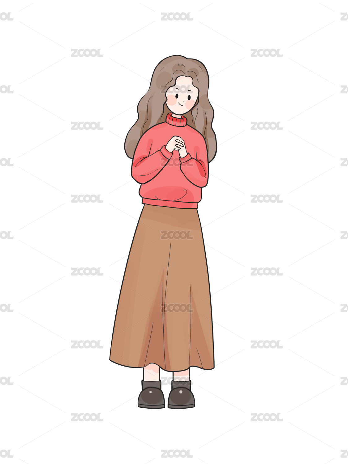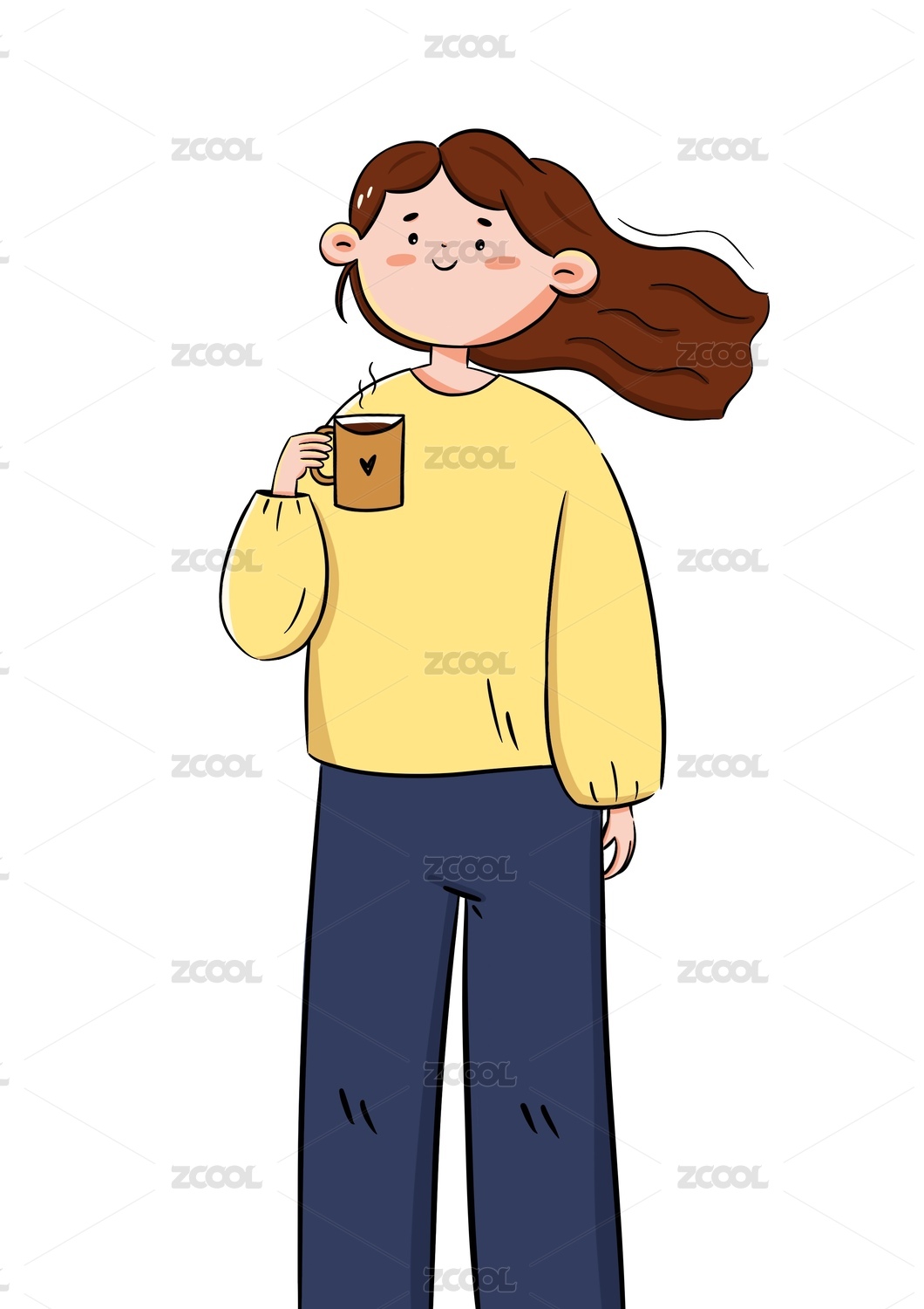 卡通,服装,日常,元素,拿着,长发,女人,可爱,全身,咖啡