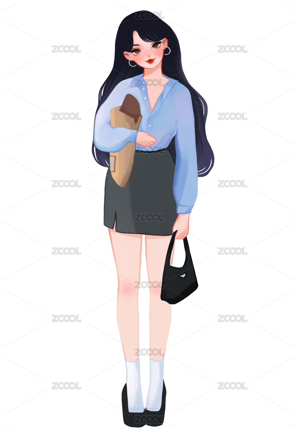 穿裙子手拿一袋橘子挥手的穿搭人物插画