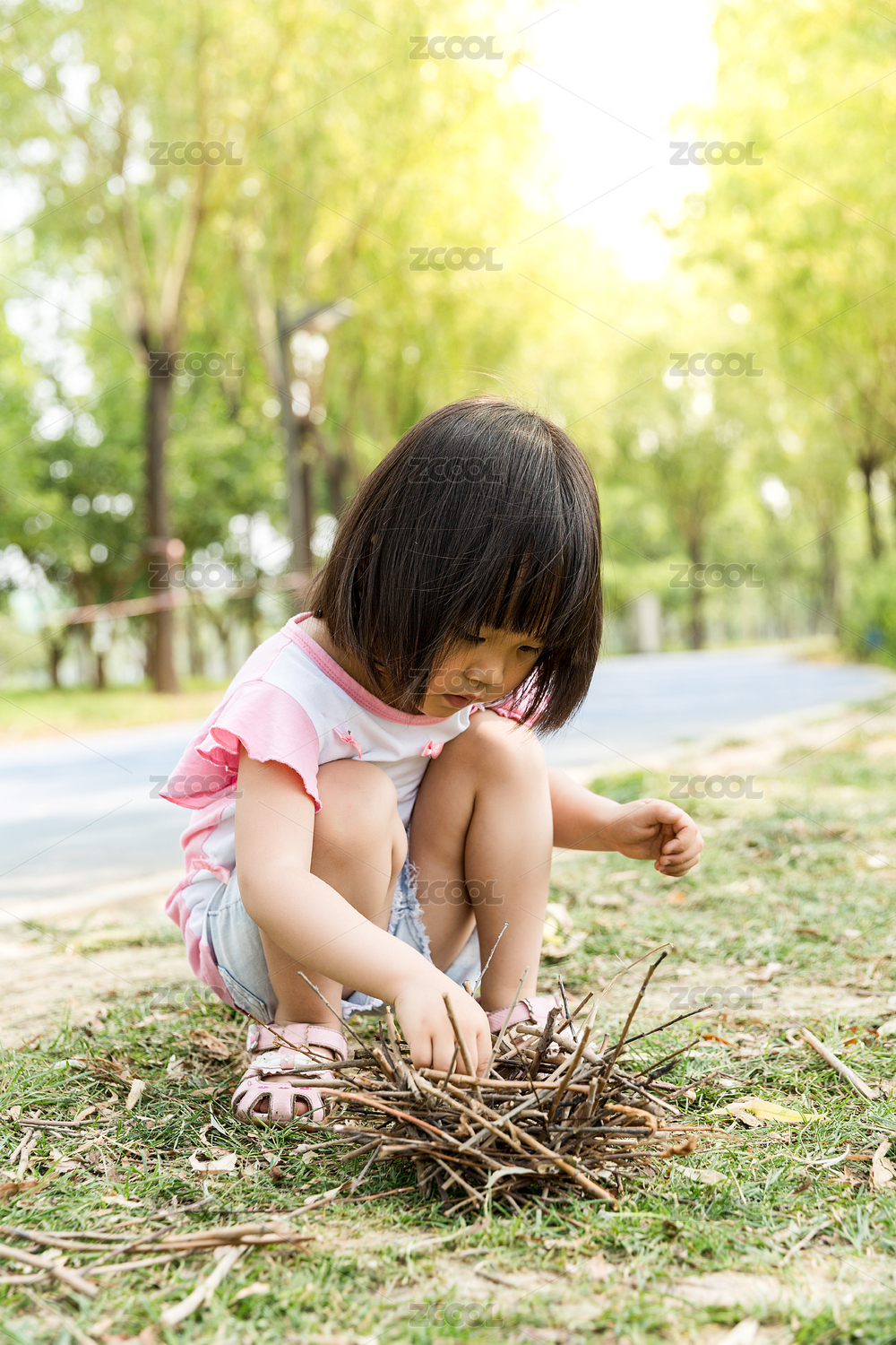 城市郊外公园里用树枝搭建小鸟窝的小女孩