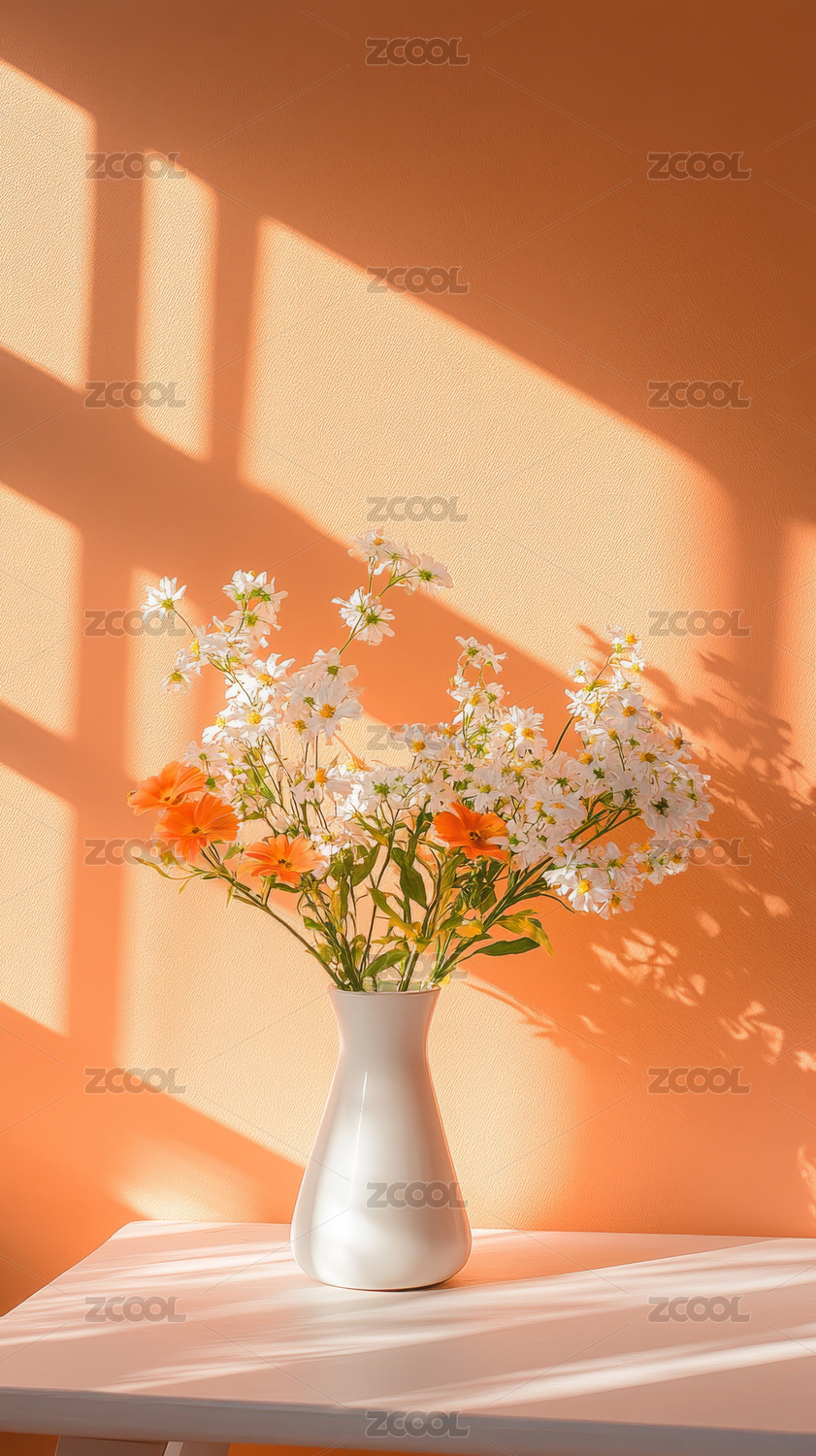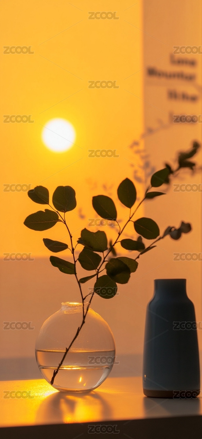 傍晚晚霞阳光橙墙树影蓝色花瓶宁静安详