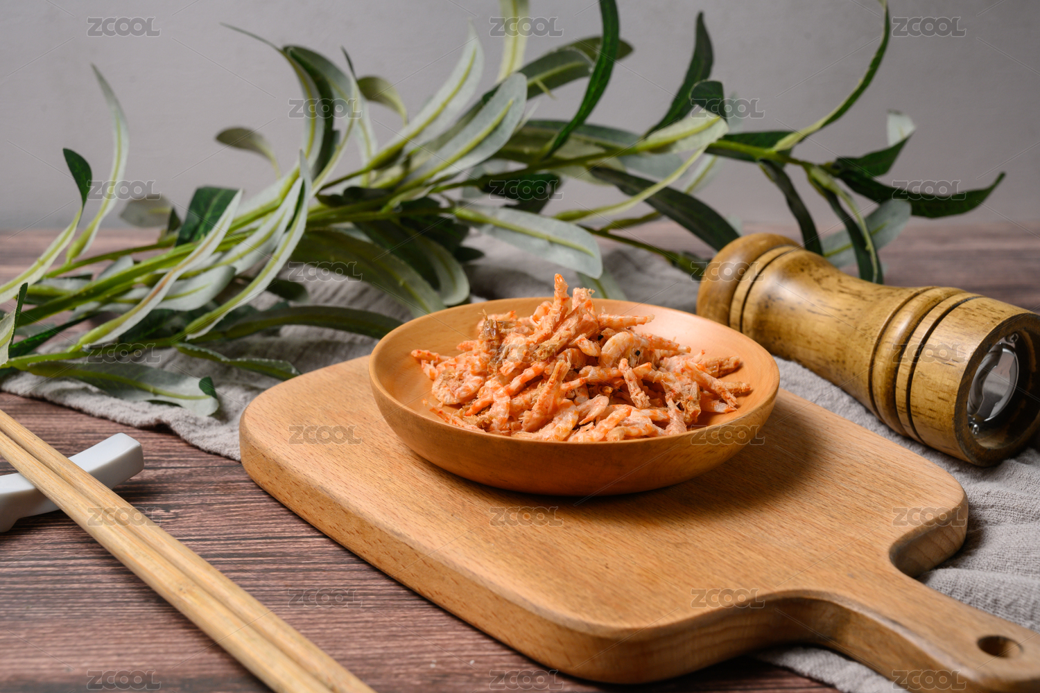 桌面上的盘子里的美味可口的磷虾干