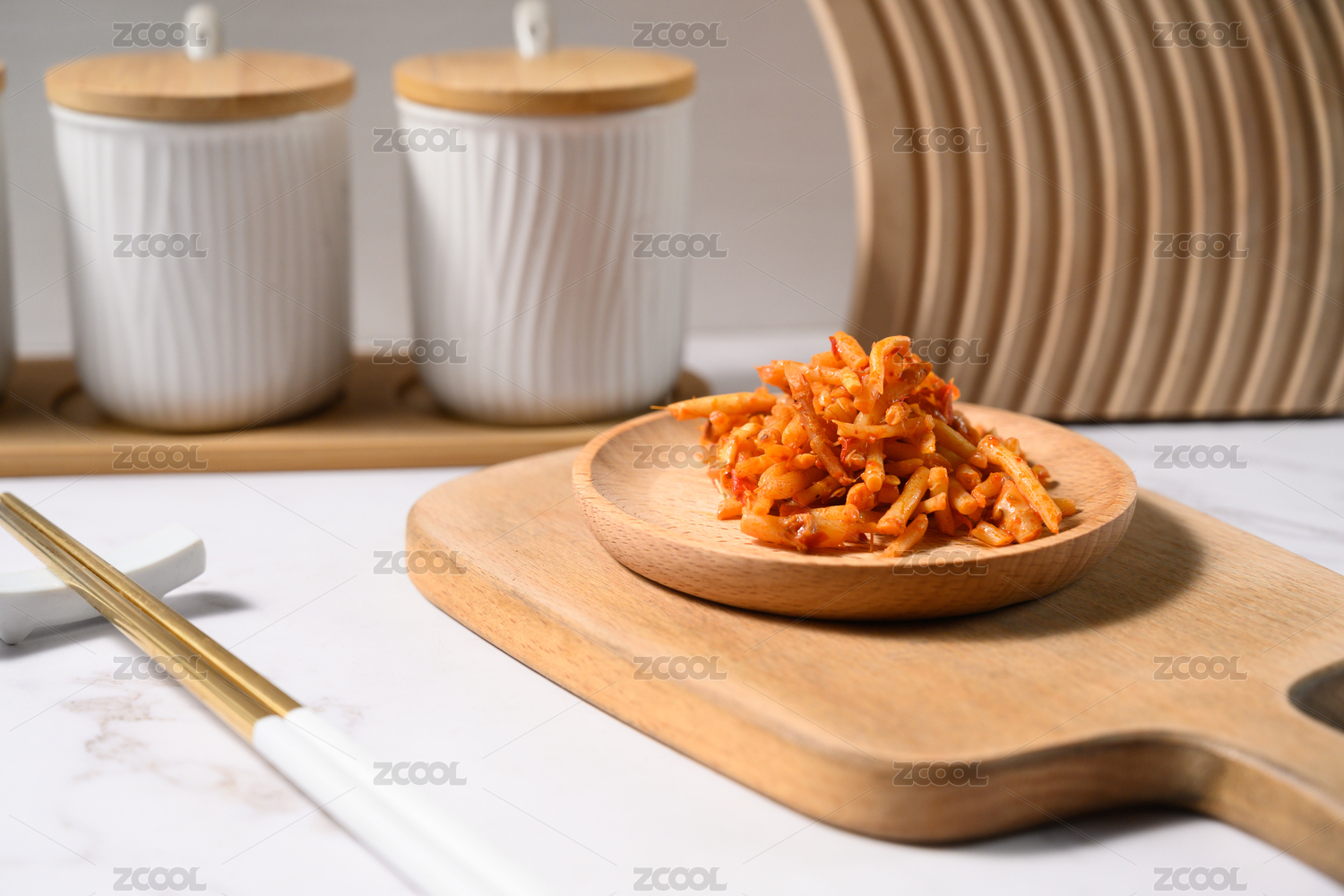 桌面上的白色盘子里的美味可口的韩式泡菜