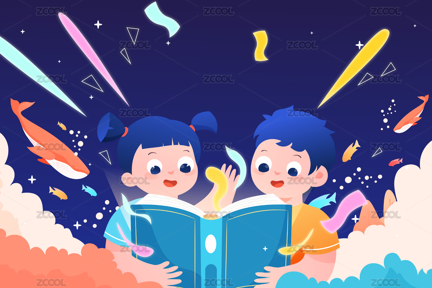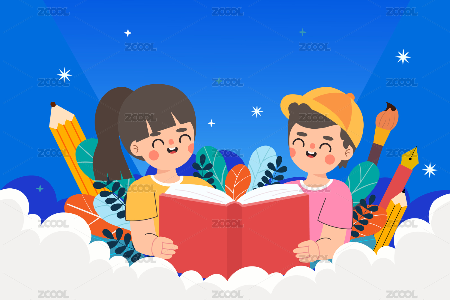 快乐阅读的小学生矢量插画