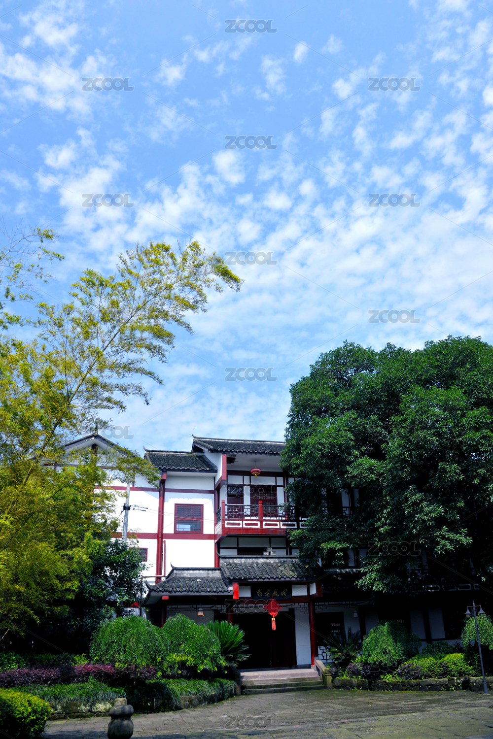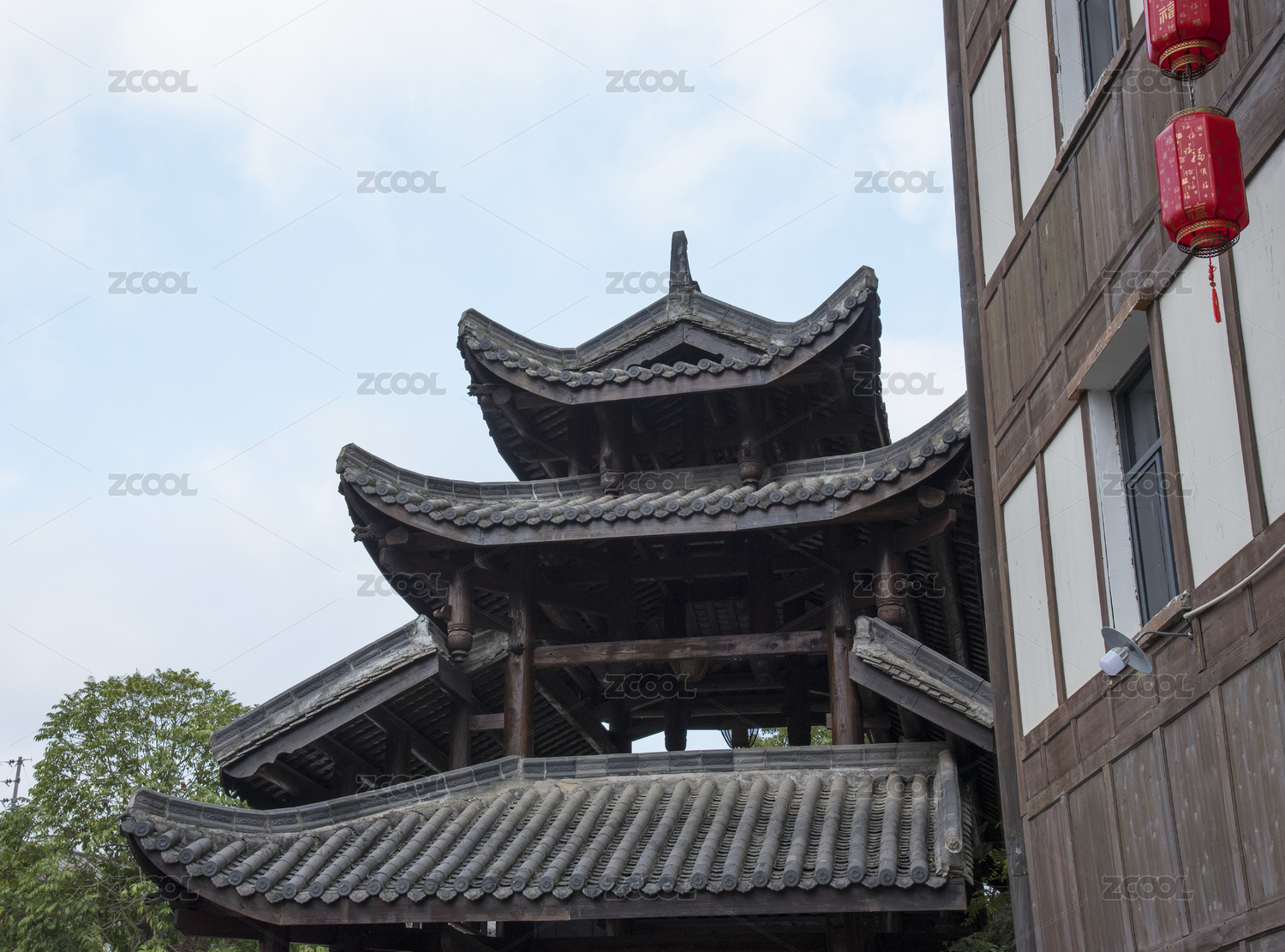 中式瓦片屋顶与蓝天白云