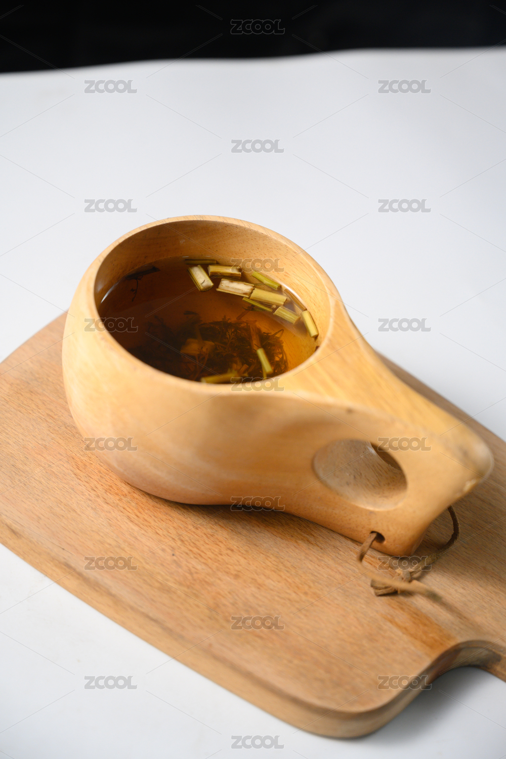 桌面上的杯子里的甘甜可口的油甘叶茶
