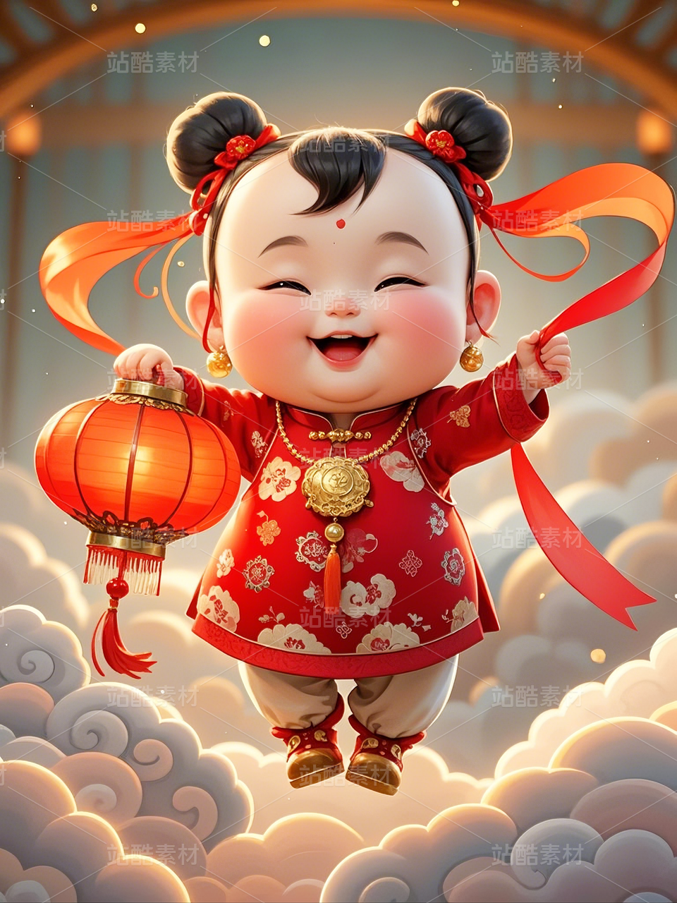 插画艺术的拿灯笼的女娃娃喜庆新年