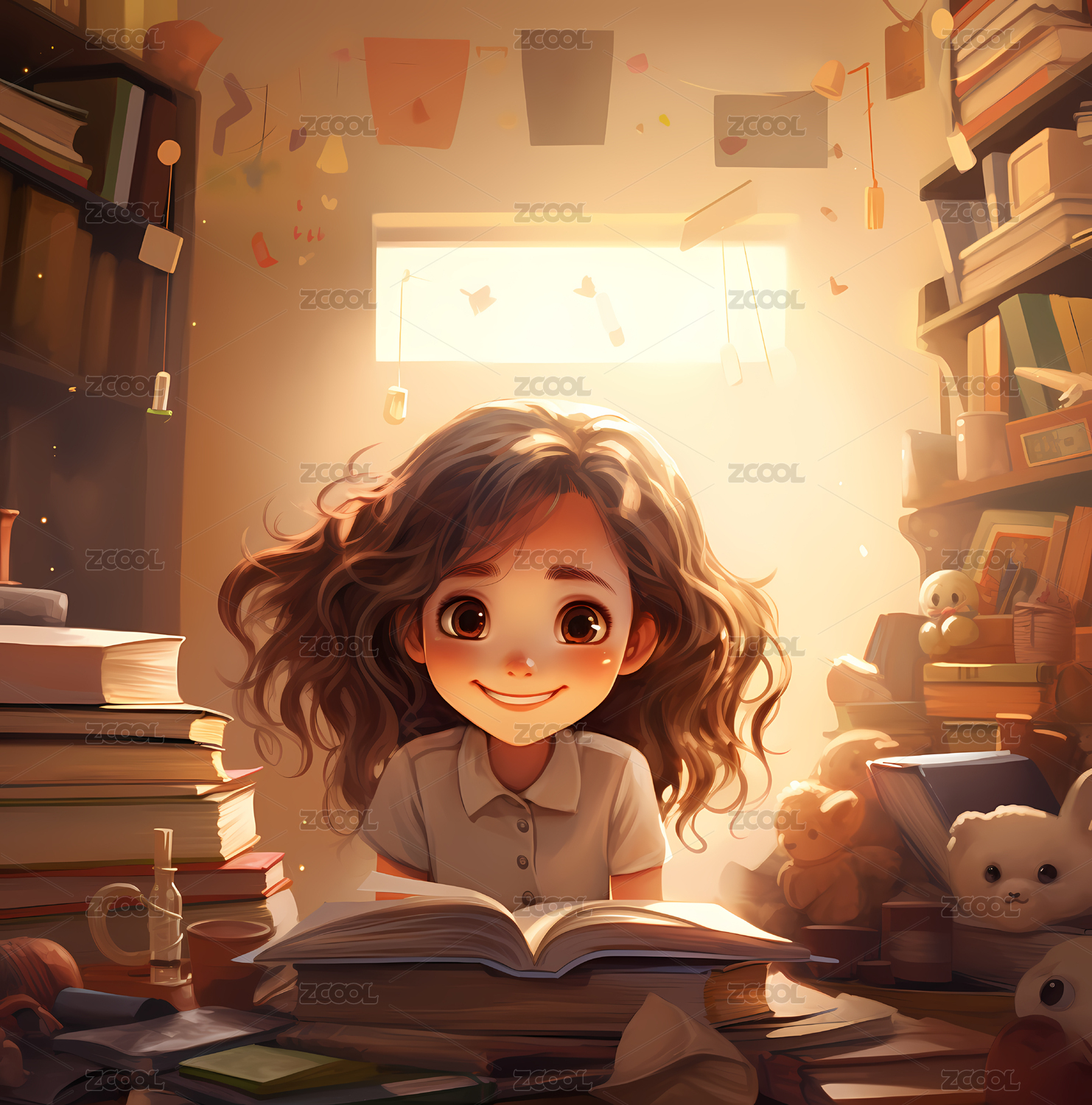 3D卡通书桌前学习的小女孩