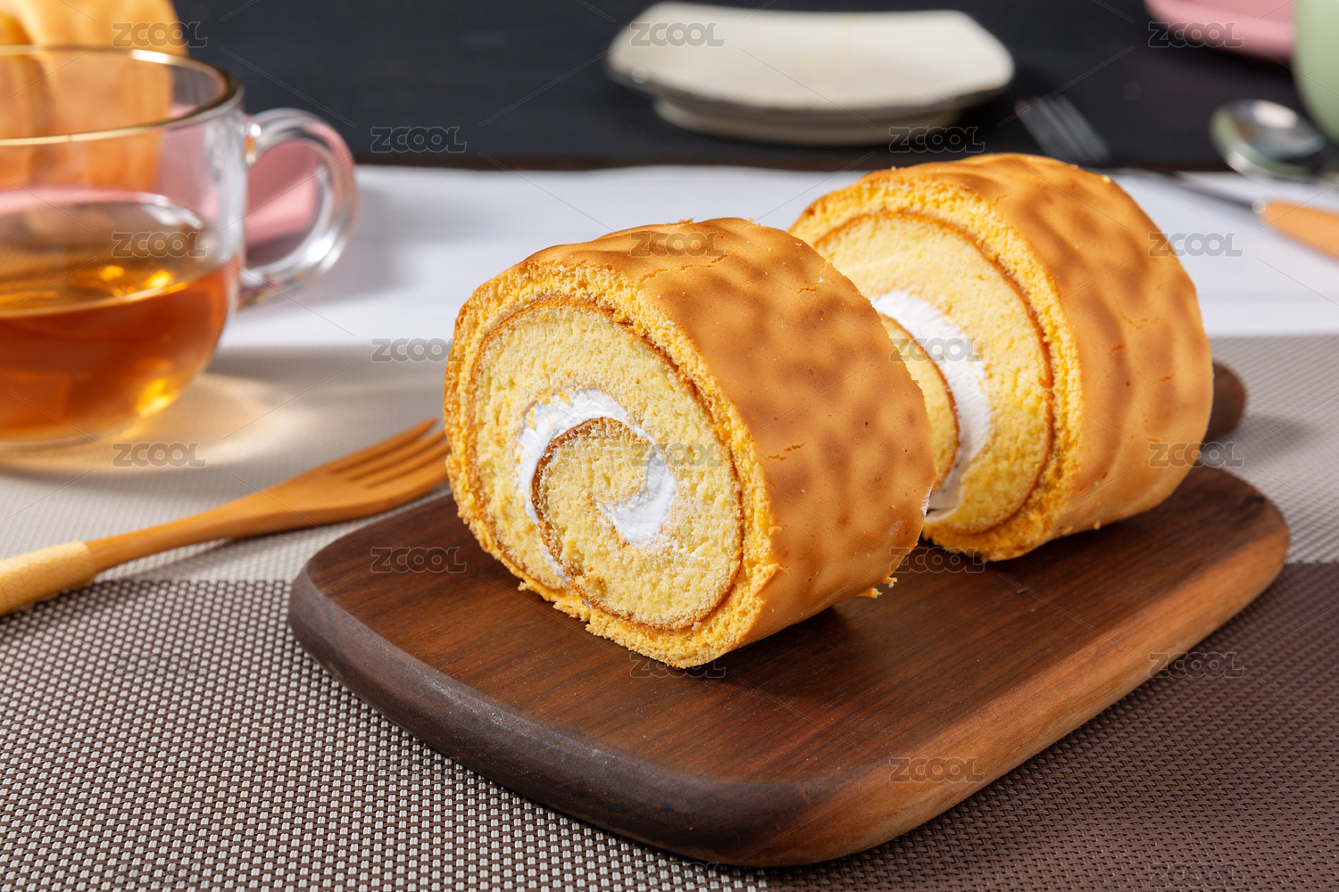 餐桌上木制托盘上的虎皮奶油蛋糕卷